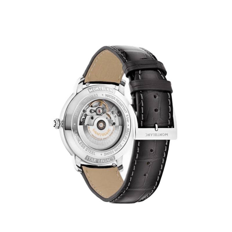 Faisant preuve d'un grand savoir-faire et dotée d'une grande renommée à l'échelle internationale, la marque Montblanc ne cesse de faire parler d'elle grâce à ses créations élégantes et sophistiquées. Chacune d'elles arbore un design avant-gardiste et se démarque grâce à la finesse de leurs finitions et le soin apporté à chaque détail de leur conception. Cette montre MB130958 de la collection Star Legacy en édition limitée se caractérise par une qualité exceptionnelle et un style unique. Avec elle, soyez certain d'être élégant à chaque occasion du quotidien. Avec un diamètre de 39 mm et une épaisseur de 9,35 mm, son boîtier de 55 grammes en acier inoxydable conviendra parfaitement aux poignets masculins. De forme ronde, il arbore une belle finition polie qui apporte de la brillance à l'ensemble. Sa surface est survolée par un verre saphir bombé qui protégera efficacement le cadran des risques d'usure et de chocs inesthétiques pouvant lui nuire. Ce dernier est traité antireflet afin de permettre une lecture optimale du temps. Sur le côté droit du boîtier, se trouve une couronne ornée du logo de la marque. Elle permet le réglage des aiguilles et du guichet. Quant au fond emboîté, il assure au modèle une étanchéité de 5 ATM. À noter que ce dernier est également transparent pour vous offrir une visibilité du mécanisme lorsqu'il est en mouvement.