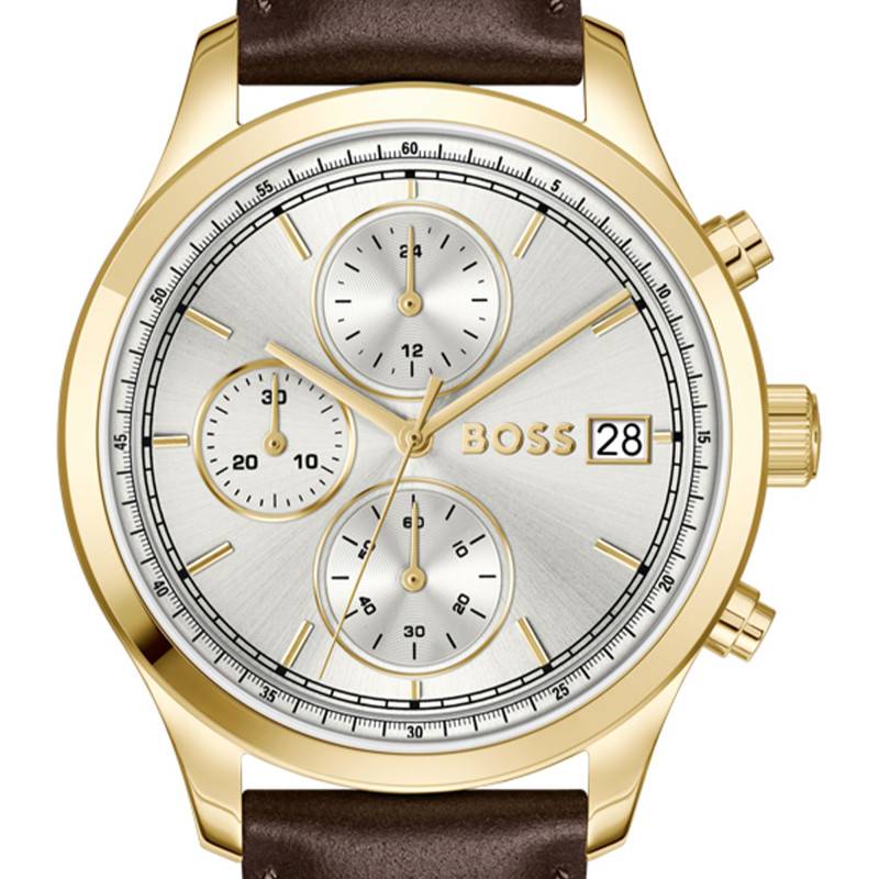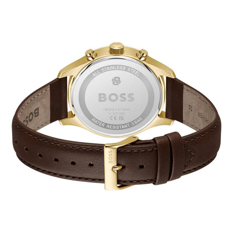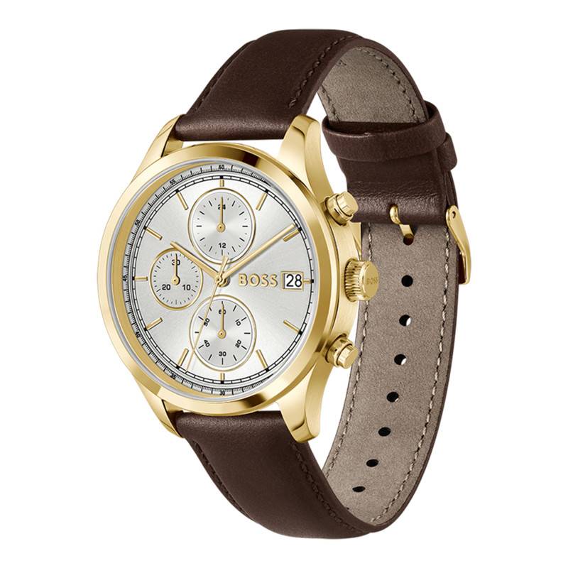 Ce garde-temps est doté d'un bracelet en cuir marron rehaussé de surpiqûres subtiles, créant un contraste visuel harmonieux avec le boîtier doré. Ce bracelet est terminé par une boucle ardillon, facile à manipuler et assurant une fermeture sécurisée.