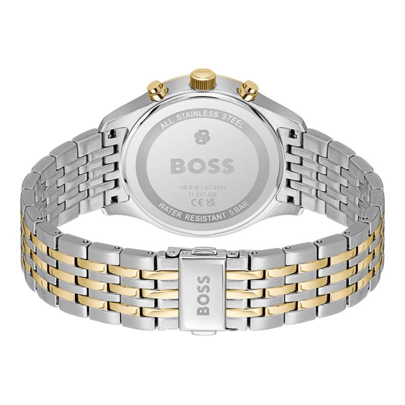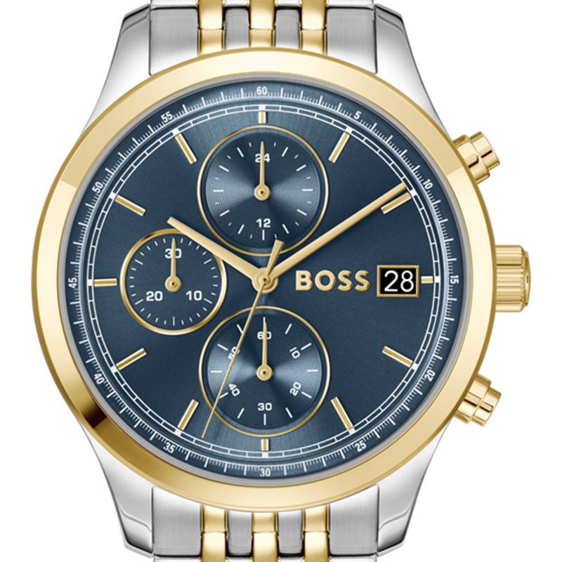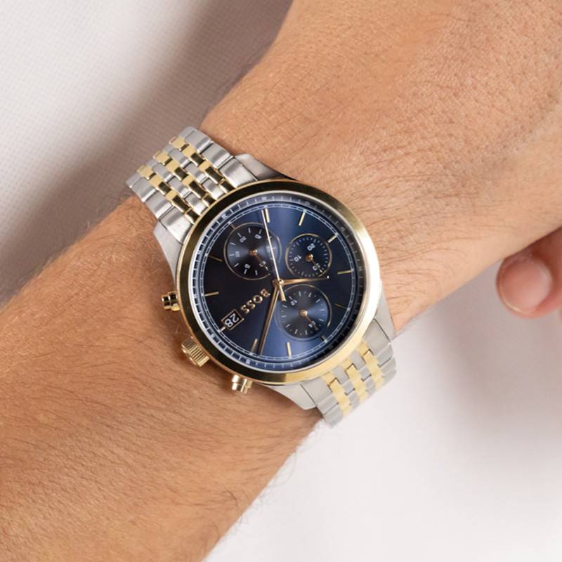 La montre Stratus de Boss incarne l'élégance moderne avec ses lignes épurées et sa construction robuste en acier inoxydable. Le boîtier rond, d'un diamètre de 41 mm et d'une épaisseur de 10 mm, offre un équilibre parfait entre confort et présence visuelle. Finement travaillé, le boîtier pèse 130 g, reflétant la solidité sans excès de lourdeur sur le poignet. La lunette en acier, avec sa finition polie, encadre le cadran avec éclat, offrant un contraste subtil mais distingué entre le gris et le doré. Les boutons poussoirs et remontoirs situés sur le côté droit du boîtier ajoutent une dimension fonctionnelle, permettant une manipulation aisée des réglages et des fonctions du chronographe. Le fond emboîté préserve l'harmonie de l'ensemble tout en offrant une étanchéité à 5 ATM, adaptée à une utilisation quotidienne sous la pluie ou lors d'activités aquatiques légères.