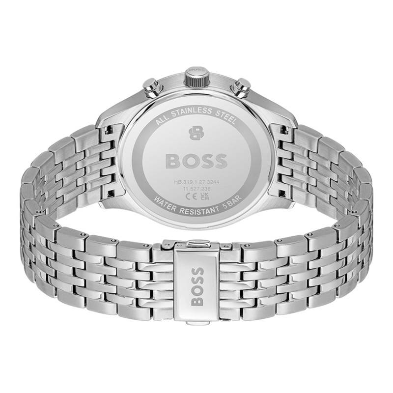 La montre Stratus par Boss, avec son style sophistiqué, se distingue immédiatement par sa couleur grise dominante rehaussée d'un cadran vert. Le boîtier rond en acier inoxydable d'une épaisseur de 10 mm et d'un diamètre de 41 mm offre non seulement une excellente protection mais aussi une allure élégante et moderne. Sa construction en acier permet non seulement de conférer une solidité remarquable à la montre, mais également de maintenir un poids de 130 grammes assurant une présence robuste au poignet. La lunette en acier de haute qualité à finition polie complète l'ensemble en offrant une protection supplémentaire tout en accentuant l'élégance générale. Sa couronne et ses deux boutons poussoirs sur le côté droit du boîtier ajoutent une touche de dynamisme et un accès facile aux fonctionnalités, rendant cet instrument à la fois raffiné et facile à utiliser.