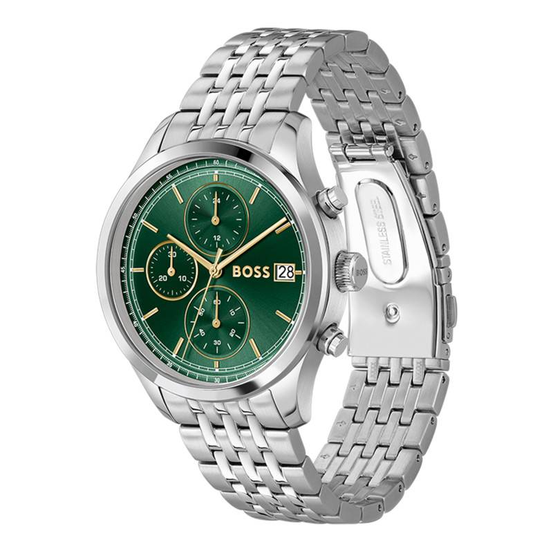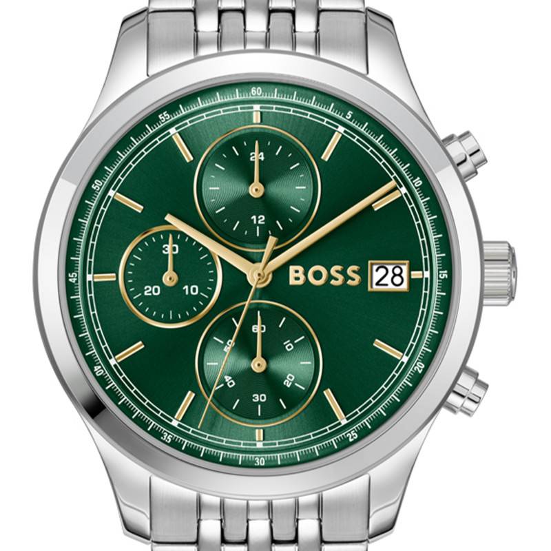 Le cadran vert de cette montre Boss est un véritable atout de distinction. Avec sa finition soleillée, il reflète la lumière de manière éblouissante et attire le regard en toutes circonstances. Le chemin de fer des minutes qui encadre les heures, les minutes et les secondes, ainsi que les trois compteurs additionnels pour les fonctions chronographe, petite seconde, et 24 heures, offrent une lisibilité exemplaire. Le guichet de date discret à 3 heures ajoute une fonctionnalité pratique tout en maintenant l'esthétique épurée du cadran. Les aiguilles, avec leur mouvement fluide, viennent compléter cette lecture facile, rendant chaque coup d'œil captivant et informatif.