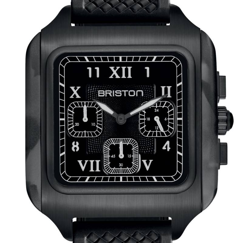 Le bracelet est fabriqué en élastomère FKM noir, une matière reconnue pour sa résistance aux intempéries et sa souplesse. Sa largeur de 20 mm et sa conception interchangeable permettent un réglage personnalisé et un style renouvelable selon les occasions. La boucle ardillon, discrètement gravée du logo BRISTON, assure une fermeture sécurisée, témoignant d'un souci du détail et d'une qualité exceptionnelle.