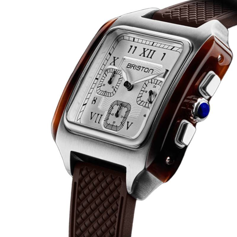 Le cadran de la Briston Streamliner Kennedy est d'une finesse admirable, exhibant une couleur blanche qui accentue son côté pur et net. Ce cadran présente une finition guillochée semi-brillante, offrant un jeu de lumière exquis et une profondeur discrète qui attire le regard. Les chiffres romains utilisés pour indiquer les heures apportent une touche classique qui contraste agréablement avec l'esthétique contemporaine du boîtier carré. L'affichage analogique se fait à travers des aiguilles fines, revêtues de SuperLuminova C1, garantissant une lisibilité exceptionnelle même dans des conditions de faible luminosité. Le cadran abrite également trois compteurs auxiliaires qui indiquent les fonctions chronographiques : un compteur pour 24 heures, un pour 60 minutes et une petite seconde. Un guichet discrètement intégré permet aussi l'affichage de la date, enrichissant le cadran d'une fonction pratique supplémentaire tout en préservant son équilibre visuel.