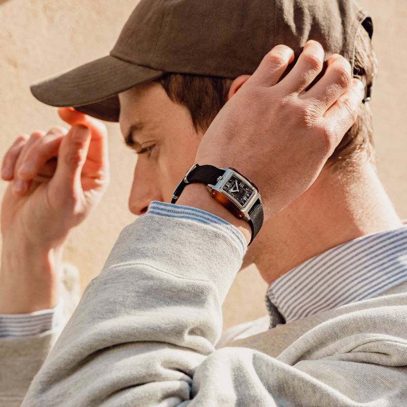 Le bracelet en Nato de couleur noire est à la fois robuste et confortable, capable de résister à l'usure quotidienne tout en conservant un style moderne. Sa largeur d'entrecorne de 18 mm est parfaitement adaptée à la dimension du boîtier, assurant un ajustement harmonieux. La boucle ardillon argentée contribue à la sécurité et au maintien. Ce choix de matériau et de couleur se marie parfaitement avec le boîtier carré, offrant une montre à l'allure sophistiquée et versatile.