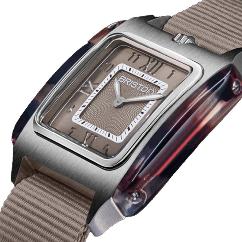 Ce garde-temps signé Briston incarne une allure à la fois élégante et moderne grâce à son boîtier carré aux dimensions parfaitement équilibrées de 30 mm par 8 mm d'épaisseur. Le choix de l'acier inoxydable 316L pour le corps principal confère à cette montre une robustesse renommée parmi les spécialistes, tout en affichant une finesse polie et satinée qui attire irrésistiblement l'œil. Outre l'acier, l'utilisation de l'acétate de cellulose pour certaines touches est un choix esthétique qui apporte une subtile nuance rouge à l'ensemble, créant un contraste visuel saisissant. Le verre minéral bombé s'intègre avec harmonie, rehaussant non seulement la protection du cadran, mais accentuant également le look rétro-chic.