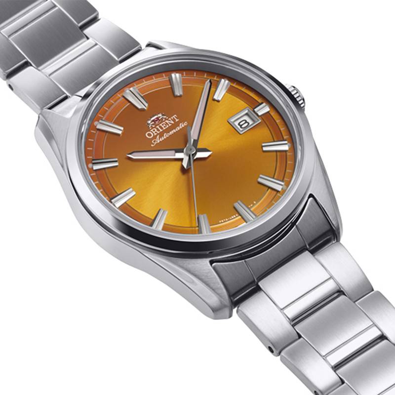 Le cadran de cette montre Orient est un véritable festival de couleur et de design sophistiqué. Arborant une teinte orange lumineuse, il capte subtilement la lumière grâce à sa finition soleillée, projetant ainsi un jeu de reflets spectaculaire à chaque mouvement. Les index appliqués, ainsi que les aiguilles luminescentes, ressortent magnifiquement contre le fond vibrant, assurant une lisibilité optimale en toute circonstance. Le chemin de fer est délicatement tracé pour une lecture précise des minutes, tandis que la fonction de date, située à 3 heures, se démarque par sa simplicité d'accès et son intégration harmonieuse dans l'ensemble du cadran.