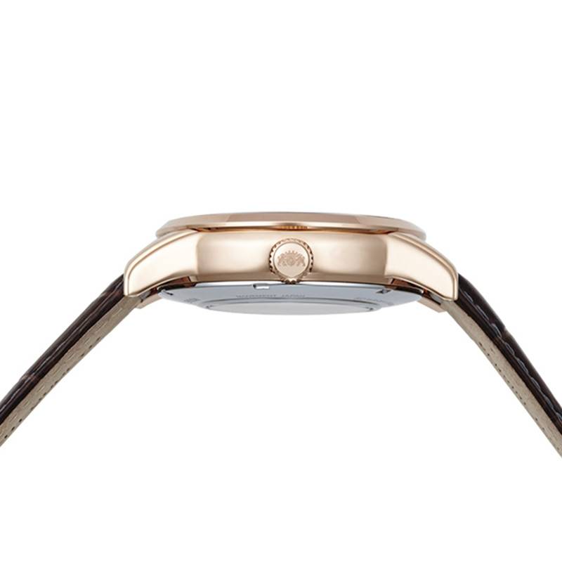 Très élégant et minimaliste, le cadran de ce garde-temps arbore des courbes arrondies. Sa couleur marron lui permet de s'accorder parfaitement avec le reste de la montre. Elle présente en son centre trois aiguilles blanches qui indiquent les heures, les minutes et les secondes. Ces dernières vous montreront le temps qui est représenté par des index chiffre romain. Elles oscillent également sur le pourtour du cadran qui est habillé d'un délicat chemin de fer des minutes. Il vous donnera davantage de précision dans la lecture du temps. Afin de se démarquer du fond de la montre, ces éléments sont de couleur blanche. Au niveau de l'index de 8 heures, vous trouverez un guichet date vous informant de la date du jour. Ce dernier est accompagné de deux compteurs situés à 10 et 5 heures. Ils vous présenteront respectivement le jour de la semaine ainsi que les différentes heures de la journée, c'est-à-dire celles du jour et de la nuit. Enfin, vous trouverez le logo de la maison sous l'index de 2 heures.
