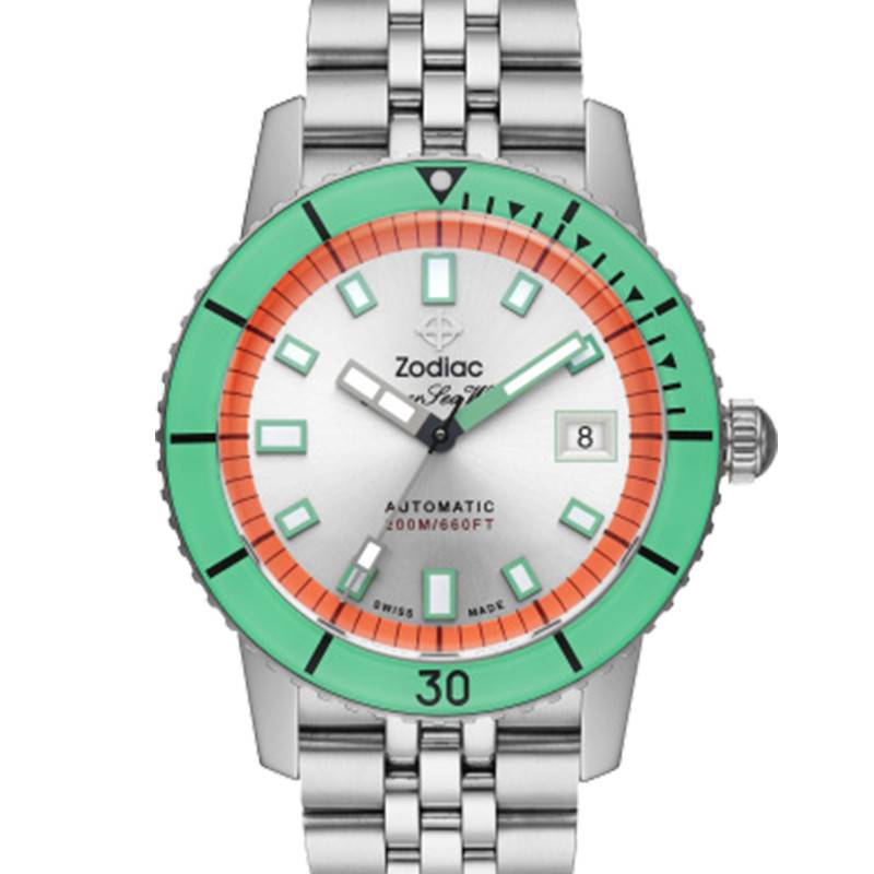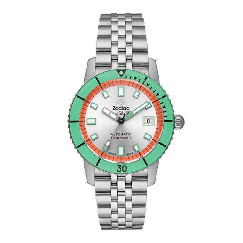 La maison Suisse Zodiac vous présente ce ravissant modèle issu de sa collection Super Seawolf. Connue pour ses sublimes modèles de plongeuses apparues en 1953, la marque s'est très vite fait une place dans le cœur des amateurs de ce modèle devenu iconique. Aujourd'hui, elle revient dans une version modernisée et colorée ! Montre sportive et terriblement élégante, elle vous suivra dans toutes vos activités. Son boîtier en acier inoxydable affiche un diamètre de 40mm pour une épaisseur de 13mm, idéal pour un poignet masculin. Afin de protéger le cadran des malencontreux chocs et autres rayures, ce dernier se dote d'un verre Saphir ultra-résistant. Le verre est doté d'un traitement anti-reflet afin de ne pas gêner votre lecture. Il se voit surplomber par une magnifique lunette verte unidirectionnelle qui se montrera utile afin de calculer le temps passé sous l'eau. C'est au niveau de l'index de trois heures que vous trouverez une couronne crantée utile afin de régler vos aiguilles, régler le guichet date ou encore effectuer votre remontage. Enfin, son fond de boîte vissé vous assure une étanchéité de 20 atmosphères.