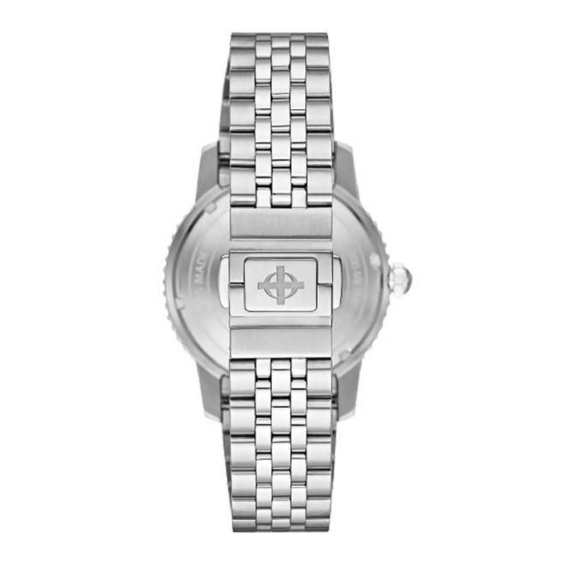 Afin de parfaire le look de cette plongeuse, cette dernière s'équipe d'un bracelet en acier inoxydable à cinq maillons. Connu pour sa grande robustesse, il résistera parfaitement à l'eau et aux temps. Il s'équipe d'une boucle clipable afin de le sécuriser au poignet. Il viendra s'ajuster parfaitement après simple mise à taille. Veuillez noter que l'entrecorne est de 20mm.