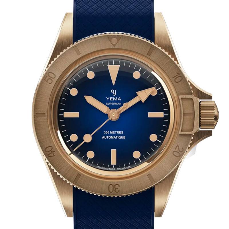 Fondée en 1948, Yema est une entreprise horlogère française qui a su faire ses preuves sur le marché horloger grâce à ses créations de belle facture. Elle conçoit des montres spécifiquement pour la plongée, la course automobile, l'exploration spatiale et la voile. La marque s'appuie sur une technologie moderne, ce qui fait qu'elle est toujours à l'avant-garde en matière de conception de montres. Ses garde-temps se caractérisent par des calibres manufactures d'une grande précision dotés de performances accrues ainsi que par leurs designs superbement finis. La Superman est l'un des modèles emblématiques. Lancée par Yema en 1963, c'est une plongeuse typique qui est aujourd'hui revisité avec un nouveau calibre entièrement conçu dans les ateliers de la marque à Morteau. Baptisée Superman Bronze CMM.10 Bleu 11.13.35, cette montre est proposée en édition limitée à 1948 exemplaires et a été lancée lors d'une mission océanographique qui avait pour objectif de suivre une famille de 30 cachalots de l'océan Indien sur plusieurs années. Cette montre est conçue en association avec François Sarano, un océanographe français et fondateur de l'association de protection marine Longitude 181. Elle affiche un style rétro et a la particularité d'être destinée à être portée sous l'eau et sur terre. Son boîtier est proposé en deux tailles de 39 mm et de 41 mm et s'adapte aux poignets masculins. Le premier dispose d'une épaisseur de 10,70 mm et d'une longueur corne à corne de 48 mm pour une ouverture de cadran de 27 mm. La deuxième taille affiche également une épaisseur de 10,70 mm, mais une longueur corne à corne de 49,50 mm et une ouverture du cadran de 30 mm. Ce boîtier rond est entièrement conçu en bronze et sera du plus bel effet à votre poignet. Il conserve les éléments de design classiques du modèle et présente des cornes pointues et allongées. Ce dernier accueille une lunette assortie avec un crantage bien soigné et une surface brossée et soleillée qui renforce son allure charmante. Unidirectionnelle, celle-ci affiche une graduation 0-60 et un repère en bille luminescente à 12 heures traité au Super-LumiNova Grade A. L'un des signes caractéristiques de cette version est le bloque lunette, situé à 3 heures, juste où se trouve la couronne. Vissée et crantée, elle assure le réglage des heures et des minutes et se trouve protégée par les extensions de la carrure. Le cadran, quant à lui, est protégé par un verre saphir double dôme de 2,20 mm de hauteur qui garantit une meilleure lisibilité, une résistance accrue et un aspect résolument vintage. Pour finir, le fond de boîte vissé arbore une ouverture transparente en verre saphir permettant une visibilité sur le mouvement. Ce fond assure une étanchéité de 30 ATM et comporte un numéro de série unique ainsi qu'un numéro correspondant à l'édition limitée.
