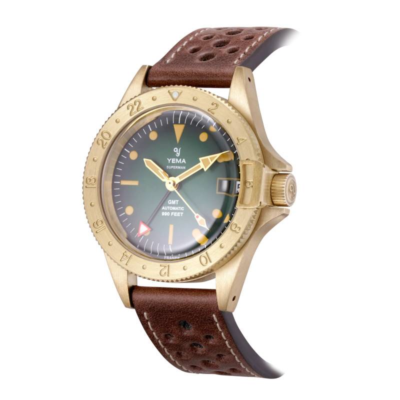 Laissez-vous séduire par le nouveau modèle de la maison française Yema, la Montre Superman Heritage GMT Bronze 41mm YGMTZ21A41-ZU31S. Issue de la gamme conçue, à l'origine, pour les militaires de l'armée de l'air française, elle conserve les codes esthétiques des anciens modèles tout en apportant de la modernité et de l'élégance. Elle se pare d'un boîtier rond en bronze poli qui mesure 41 millimètres de diamètre pour 14.3 millimètres d'épaisseur. Des dimensions parfaites pour la gent masculine. Une couronne intégrée au boîtier vient se loger à 3 heures. Elle vous servira à régler les fonctions de la montre. Sur le dessus, une lunette tournante en bronze vient envelopper le cadran. Elle dispose d'index gravés, représentants les 24 heures. De plus, un système de bloque-lunette vous permet de l'utiliser pour lire l'heure d'autre fuseaux horaires. Cette montre vous accompagnera dans toutes vos activités nautiques grâce à son étanchéité qui va jusque 300 mètres. Afin de vous offrir une qualité optimale, le fond de boîte est vissé et dispose du blason de la marque pour se distinguer. Sur le cadran, un verre saphir double dôme vient se placer. Il vous offre une parfaite protection face aux chocs et aux rayures que le port quotidien de la montre peut occasionner, mais aussi une lisibilité totale du cadran. Pour offrir ou pour vous, cette montre saura combler les amateurs de montres avertis !