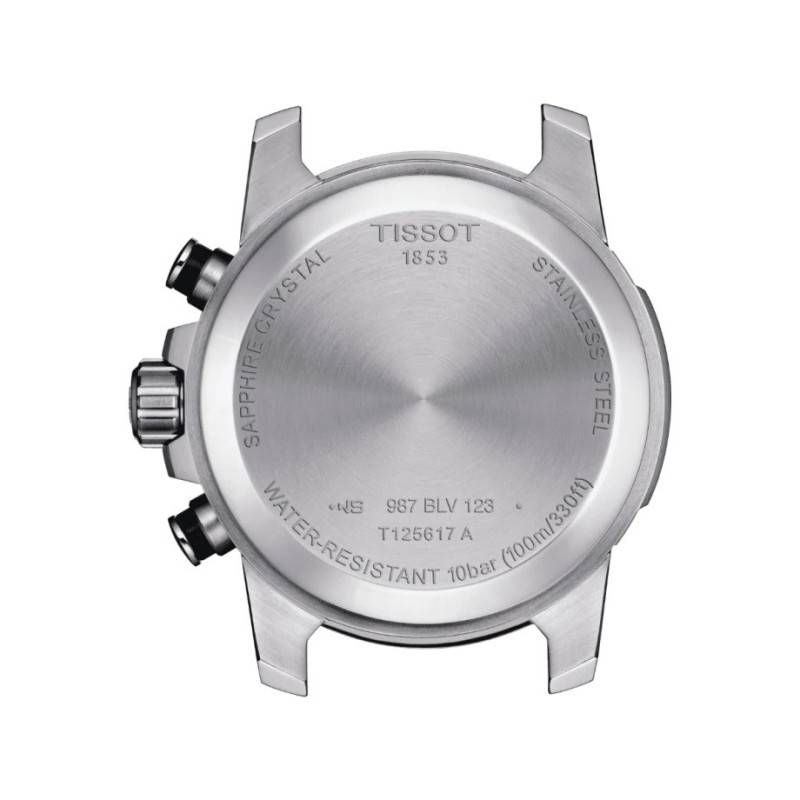 Ce cadran noir de forme ronde se présente dans un style très sportif et business. Présentés sur un cercle en relief, le chemin de fer des minutes et les larges index blancs et gris se répartissent sur le pourtour du cadran. Au centre, vous retrouvez l'affichage analogique trois aiguilles. Pour lire l'affichage de l'heure, vous disposez de façon habituelle de deux aiguilles dauphines grises et blanches, pour les heures et les minutes, et d'une façon plus originale un compteur placé à 6h pour connaître les secondes du temps. Pour l'utilisation du chronographe, vous disposez d'un compteur 30 minutes à gauche du cadran, d'un compteur 1/10 secondes sur la droite et de l'aiguille fil de couleur rouge (à la place de la trotteuse) qui fait office de « compteur 60 secondes ». Elle possède un contrepoids en forme de « T » rouge qui évoque la marque Tissot. Le guichet date est placé à 6h. Ce modèle possède une peinture luminescente dans le noir au niveau de ses index et de ses aiguilles du temps. Enfin, vous pouvez lire sur le cadran la nomination de la marque, sa date de création 1853 et le « Swiss Made ».