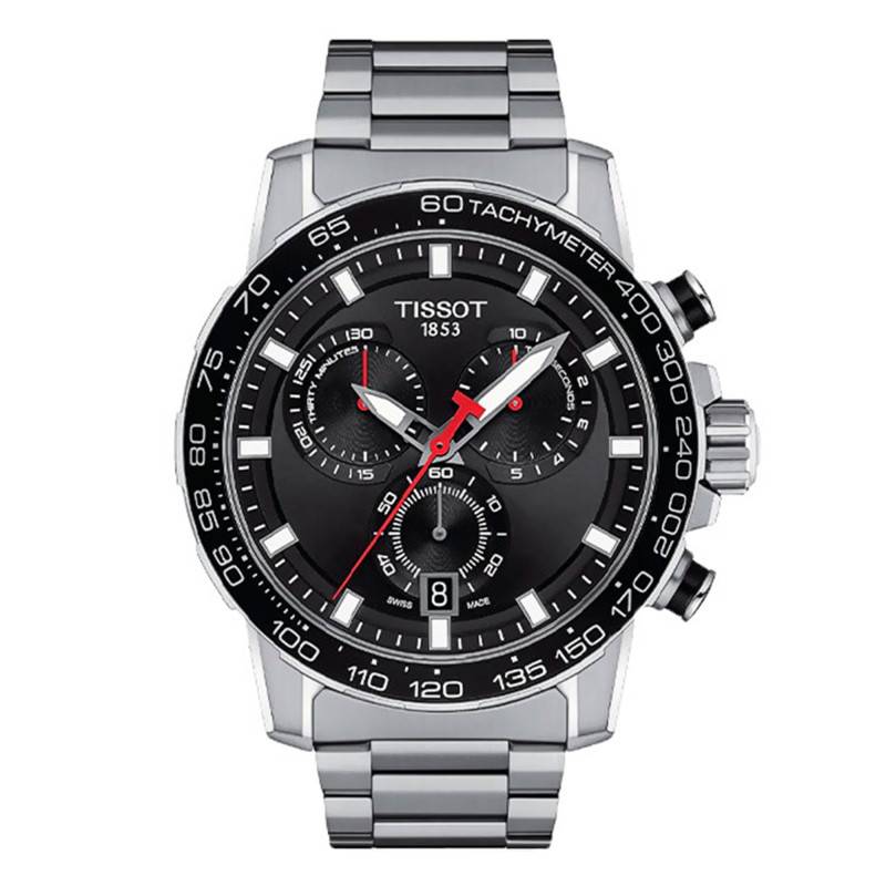 Créée en 1853, la marque Tissot propose des montres de qualité pour un bon rapport de prix. La collection pour homme Supersport Chrono met à l'honneur plusieurs modèles multifonctions. Celui ci-contre propose, au sein d'un boîtier rond de 45.5 millimètres de diamètre, les fonctions d'affichage de l'heure (heures, minutes, secondes), de la date, de tachymètres et de chronographe ! Le boîtier en acier inoxydable gris et brossé mesure 11.9 millimètres d'épaisseur. Son fond de boîte est emboîté et le boîtier comporte une couronne pour le réglage de l'heure placée à 3h. Le tachymètre se trouve sur la lunette d'aluminium graduée de gris sur un fond noir. Pour une bonne prise en main, cette lunette est cannelée sur ses bords. Un verre saphir très solide protège le cadran des rayures et des chocs. Enfin, vous pouvez utiliser les deux boutons poussoirs additionnels (à 2h et 4h) pour utiliser le chronographe. Ils ont des couleurs noires et grises assorties au design du cadran.
