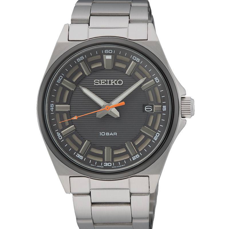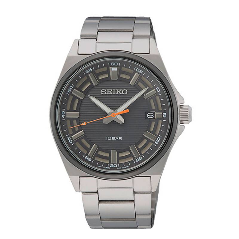 C'est un cadran rond très chic qui a été choisi pour habiller cette montre. Au centre, deux aiguilles grises et une orange s'articulent pour vous indiquer les heures, le minutes et les secondes. Un chemin de fer des minutes est situé sur le pourtour. Tout autour, vous trouverez de cinq en cinq les minutes indiquées. De plus, un guichet date sur fond noir se place dans la continuité des 3 heures pour informer de la date du jour. Enfin, Seiko pose son nom sous l'indice des douze heures.