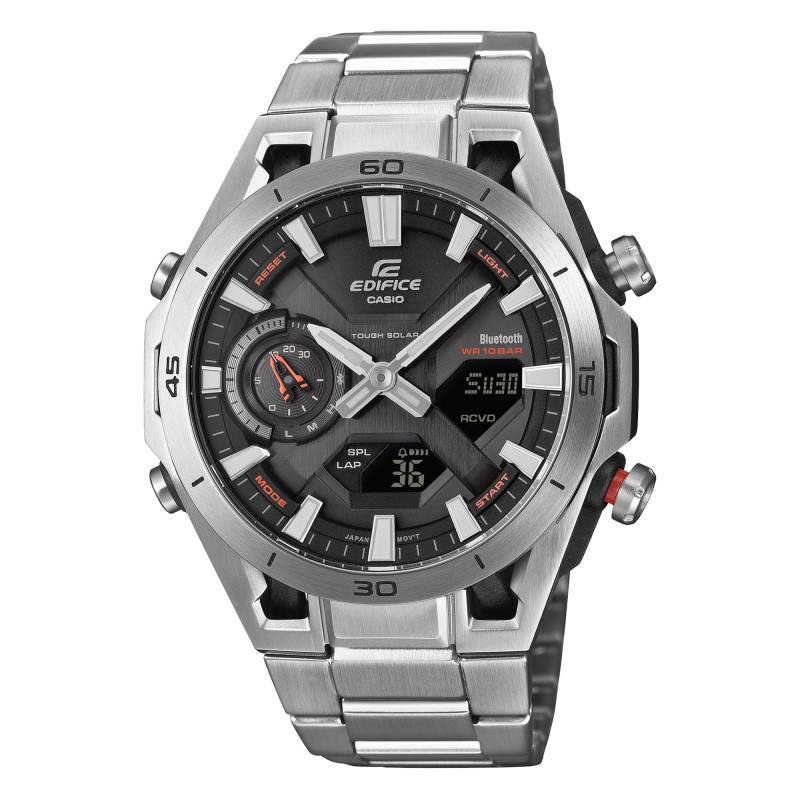 La montre Casio Edifice constitue un brillant exemple de l'innovation horlogère, associant parfaitement technologie de pointe et esthétique raffinée. Ce modèle unique, large de 45,80 mm, avec une longueur de 50,20 mm et une épaisseur de seulement 11,50 mm, se dévoile dans un format tonneau avant-gardiste. Le boîtier est élaboré en carbone et acier inoxydable, offrant une robustesse couplée à une élégance moderne, accentuée par des finitions mates brossées. Son allure est renforcée par un assemblage de couleurs grises et noires, qui confèrent à ce garde-temps une allure sobre et sophistiquée. Équipée de la technologie Bluetooth® Smart, elle permet une connexion immédiate avec votre smartphone, offrant une multitude d'utilisations avancées et un confort d'utilisation exceptionnel. Cette montre est une édition limitée, preuve de son exclusivité et de son caractère "collector", ce qui la rend encore plus prisée des connaisseurs.