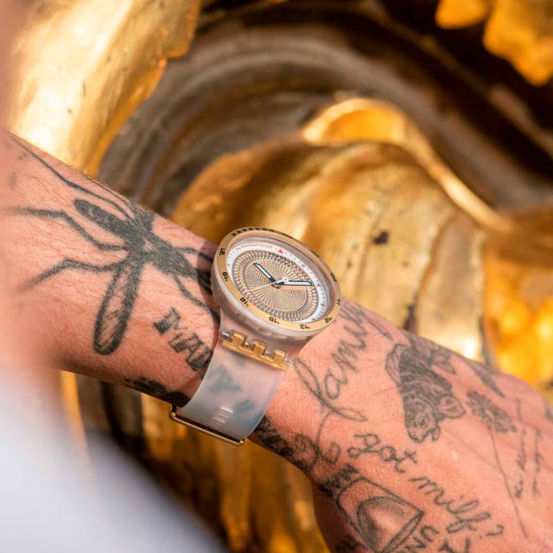 Swatch est une marque d'horlogerie suisse reconnue à l'échelle mondiale par ses montres amusantes et jeunes dans l'air du temps. Elle mêle les technologies avancées, les techniques artisanales traditionnelles et des métaux de fabrication modernes pour concevoir des modèles de haute qualité à la fois précis, durables et urbains. Collaborant avec quatre icônes de la Swatch Proteam, dont chacun a imaginé la montre de ses rêves, la marque présente aujourd'hui une nouvelle collection pleine de vie, de joie et de charme qui ne laissera personne indifférent ! Elle propose ici sa montre G-Turn SB05K105 réalisée en collaboration avec Matthias Dandois, une star du BMX flatland et athlète de la Swatch Proteam qui se démarque par sa détermination, sa créativité et sa personnalité enthousiaste. Mêlant esprit ludique et design minimaliste avec un twist audacieux, ce garde-temps provient de la ligne Swatch Proteam Collection et s'affirme comme l'indispensable des personnes excentriques et racées souhaitant ressortir leur style unique. Il s'accordera à la perfection avec toutes vos tenues en apportant à chacune d'elles une touche d'élégance sportive et urbaine exquise. De forme ronde oversize, son boîtier est fabriqué en matériau biosourcé mat et arbore un aspect transparent, mettant en valeur votre délicat poignet. Celui-ci mesure 47 mm de diamètre, 11,75 mm d'épaisseur et 44,80 mm de longueur, des dimensions résolument pensées qui le destinent aux poignets masculins et lui accordent un aspect imposant. Il est surplombé par une lunette fixe au design grainé réalisée également en matériau biosourcé transparent et entourant un verre biosourcé qui couvre le cadran. Dynamisant le design de la montre par une touche raffinée et moderne, celle-ci est marquée par des chiffres arabes imprimés en noir sur une surface dorée, retraçant les dates clés de la vie de Matthias. Contrairement à la tradition horlogère, la couronne prend place à 2h, arborant un habillement blanc. À l'aide de celle-ci, vous pourrez régler à tout moment les heures et les minutes. Cette montre résistera à l'eau à une pression de 3 bar, et ce, grâce à son fond de boîte.