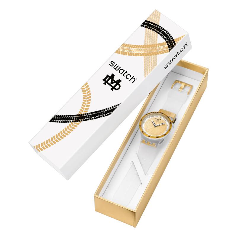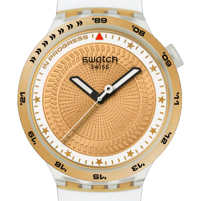Le cadran rond présenté dans le boîtier se démarque par son design racé et sa couleur dorée, faisant tout le charme de cette montre. Ce dernier arbore un fond texturé rehaussé par un motif pièce et permet une lecture temporelle claire et fluide en toute occasion. Il est survolé par deux aiguilles noires remplies de Super-Luminova blanche, vous aidant à lire les heures et les minutes dans des conditions aussi bien éclairées que sombres. Les secondes vous seront désignées quant à elle par une fine trotteuse blanche au contrepoids rond ajouré. Marqué par l'inscription “In Progress”, le pourtour blanc du cadran se voit couvert par un traitement Super-Luminova, renforçant la visibilité de l'heure dans le noir. Il est échelonné par un chemin de fer des minutes présenté par des traits dorés. Ce dernier est séparé par neuf étoiles en référence aux neuf titres mondiaux remportés par Matthias Dandois et par un triangle rouge, servant d'index pour les heures. Pour finir, Swatch appose son nom sous midi en guise de signature.