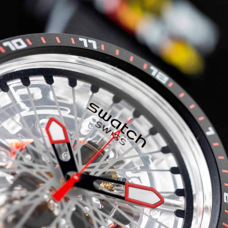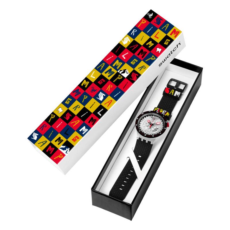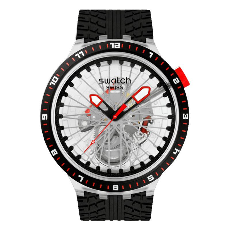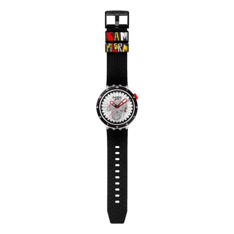 Swatch est une marque horlogère emblématique d'origine suisse appréciée par de nombreuses générations pour son identité jeune et fun. Elle présente à travers ses diverses collections des garde-temps intemporels, colorés et précis de grande qualité qui se destinent à accompagner leurs propriétaires dans toutes les aventures en leur apportant une joie de vivre au quotidien. Pour cette saison, Swatch dévoile une nouvelle gamme de montres toujours amusantes, modernes et tendances réalisées en collaboration avec des icônes de la Swatch Proteam. Toujours prêt pour partir à l'aventure, ce charmant garde-temps The Pligrim - Tread on it SB05K103 est le choix parfait pour dynamiser votre style en y apportant une touche d'élégance sportive. Son design singulier a été imaginé par le freerider britannique, superstar du VTT “Vélo Tout Terrain” et athlète de la Swatch Proteam, Sam Pilgrim. Capturant la joie de vivre de ce dernier et son esprit intrépide, cette montre saura vous accompagner dans toutes vos aventures en vous permettant de vous démarquer à chaque instant. Elle se présente avec un boîtier rond à l'aspect transparent qui est réalisé en matériau biosourcé. Ce dernier est destiné à habiller avec douceur et raffinement les poignets de la gent masculine. Il fait 47 mm de diamètre et 44,80 mm de longueur pour une épaisseur de 11,75 mm, des dimensions juste idéales pour un port agréable et confortable en toute occasion. Il est équipé d'une lunette noire au design semblable à un pneu, apportant une touche audacieuse et élégante à l'ensemble. Faite en matériau biosourcé, celle-ci est marquée par une échelle de 12 heures imprimée, présentée par des traits rouges et des chiffres arabes blancs SuperLuminova. Elle encercle un verre biosourcé qui couvre le cadran. Par ailleurs, une couronne rouge avec une dent blanche sur la surface, clin d'œil au sourire vainqueur de Sam, est installée à 3h. Elle vous permettra de régler les heures et les minutes. Pour finir, ce modèle collaboratif est étanche à 30 mètres, et ce, grâce à son fond de boîte.