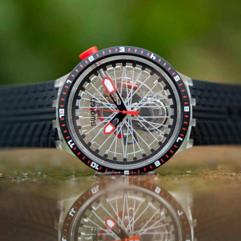 L'esprit racé de ce modèle est renforcé par un cadran rond arborant un fond transparent qui lui apporte une touche amusante et moderne. Ce dernier est décoré d'un motif épuré présentant les rayons d'une roue de vélo. Dépourvu d'index, il est parcouru par deux aiguilles ajourées mi-noires mi-rouges qui vous donneront les heures et les minutes, y compris en obscurité. Cela est assuré par leur traitement SuperLuminova blanc appliqué également sur la pointe de la fine trotteuse rouge dédiée aux secondes. Le pourtour arbore un cercle noir sablé accompagné par des demi-ronds qui connectent les rayons. Finalement, le nom de la marque est apposé sous midi, gage d'authenticité.