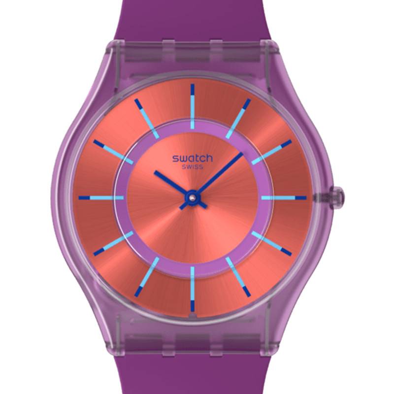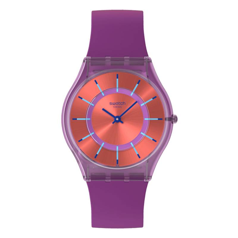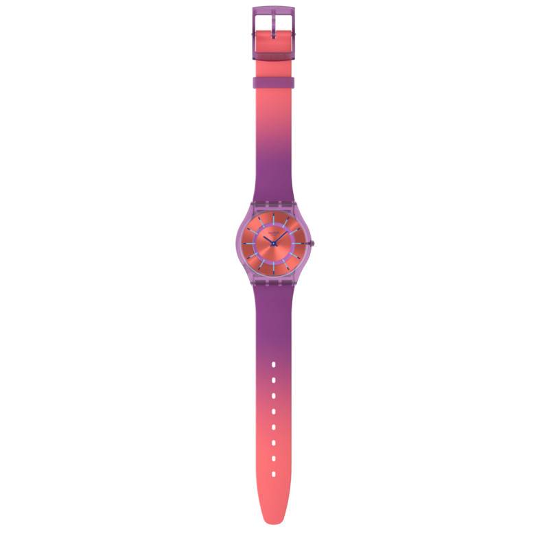 Le bracelet de la montre Sweet Strawberry Dream est fabriqué en silicone, un matériau reconnu pour son confort et sa résistance. Sa couleur vibrante mixant le rose et le violet complète parfaitement l'esthétique du cadran tout en ajoutant une touche de modernité. Le silicone, en plus de son allure contemporaine, est apprécié pour sa légèreté et sa flexibilité, offrant ainsi un confort incomparable même après de longues heures de port. Il est doté d'une boucle ardillon de couleur violette, qui non seulement lui confère une robustesse essentielle, mais aussi assure un ajustement personnalisé sur le poignet du porteur. Ce bracelet non irritant et pratique incarne l'esprit décontracté et innovant de Swatch, faisant de ce garde-temps un accessoire idéal pour toute occasion décontractée ou formelle.