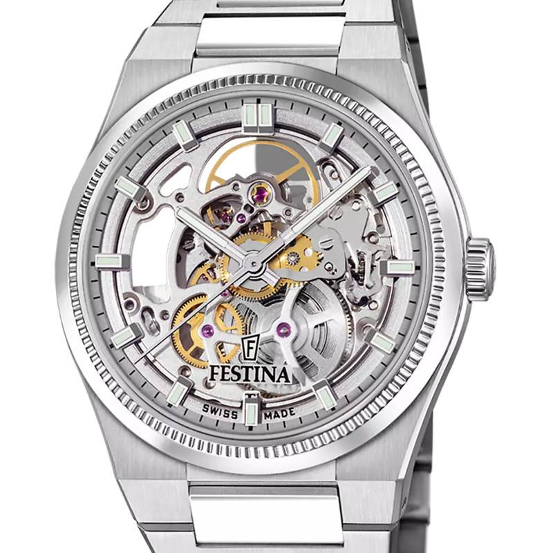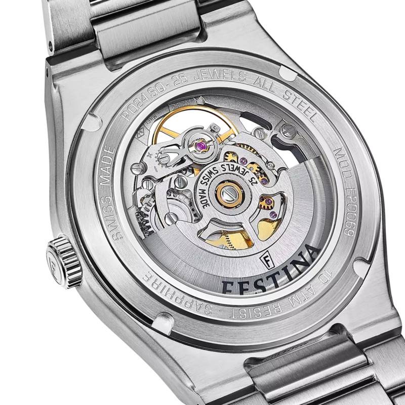Sous le cadran squelette opère un mouvement automatique suisse très sophistiqué, qui distingue la Montre Festina de ses pairs. Doté d'une masse oscillante, ce mouvement assure une excellente remontée de l'énergie nécessaire à son fonctionnement grâce au simple geste du poignet. La montre offre une réserve de marche jusqu'à 38 heures, garantissant que même au repos, lorsque vous ne portez pas la montre, elle continuera de garder le temps avec précision. Fabriquée selon les normes de l'horlogerie suisse, ce mécanisme de haute précision offre les fonctions essentielles qui incluent l'affichage des heures, minutes, secondes et de la date, démontrant ainsi une polyvalence et une sophistication qui plairont aux amateurs les plus exigeants.