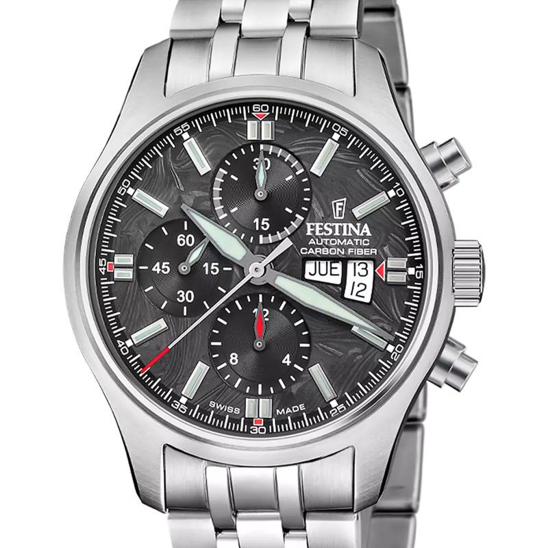 La montre Swiss Made Automatico par Festina incarne l'élégance suisse dans un design robuste et sophistiqué. Le boîtier rond est conçu en acier inoxydable. Mesurant 43,50 mm de diamètre et 15,70 mm d'épaisseur, elle se distingue par sa présence imposante tout en restant confortable au poignet. La lunette fixe encadre harmonieusement le cadran en créant une cohérence visuelle et tactile. Le fond de la montre, de type emboité, garantit une fermeture sécurisée et une protection accrue contre les éléments extérieurs. De plus, le verre saphir plat assure une lisibilité parfaite et une résistance exceptionnelle aux rayures.