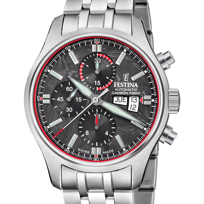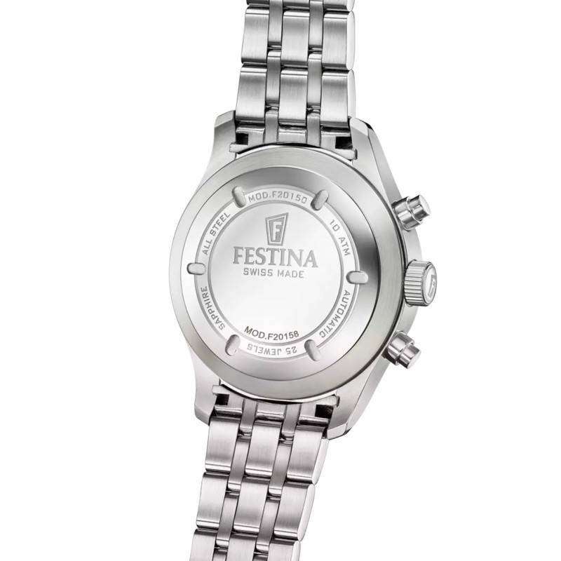 La montre Festina Swiss Made Automatico incarne l'élégance intemporelle et la robustesse horlogère, attribuables à ses racines suisses renommées. Dotée d'un boîtier rond, cette pièce mesure 43,50 mm de diamètre et une épaisseur de 15,70 mm, un gabarit idéal pour occuper fièrement le poignet. Ce boîtier est réalisé en acier inoxydable, gage de solidité et de pérennité. Avec sa lunette fixe, elle entoure harmonieusement le cadran pour assurer une protection accrue contre les chocs. L'assemblage est minutieusement finalisé par un fond de boîtier emboité, promettant une étanchéité fiable tout en préservant l'esthétique raffinée de l'objet.