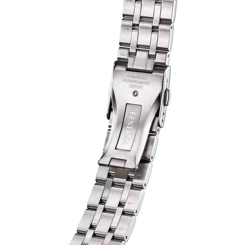 Le bracelet de la montre est en acier inoxydable, en parfaite harmonie avec le boîtier. Mesurant 20,95 mm de largeur, il assure un port confortable et sécurisant grâce à son fermoir boucle déployante en couleur argentée.
