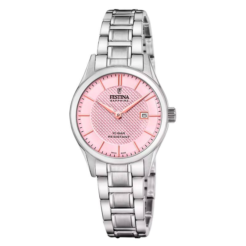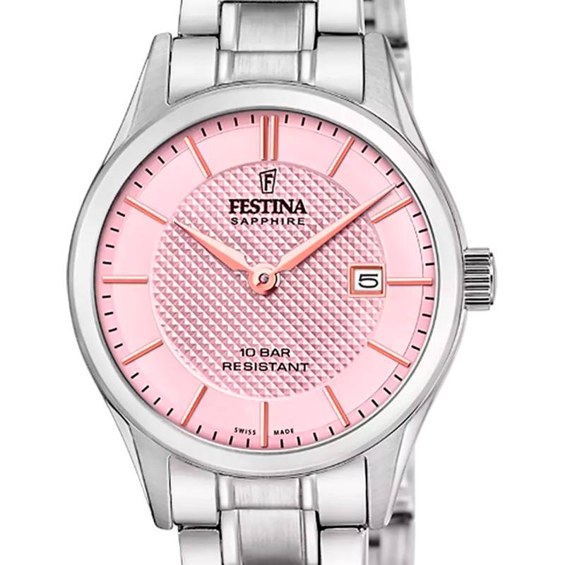 Le cadran de cette montre Festina Swiss Made arbore une magnifique couleur rose qui respire la délicatesse et la féminité. Sa finition en « Clous de Paris » et « Double cercle » crée un jeu de textures captivant sous différents angles de lumière, ajoutant une dimension de luxe au design. Les heures et minutes sont indiquées par des aiguilles analogiques classiques, tandis qu'un guichet subtilement intégré affiche la date. Les index et le chemin de fer des minutes garantissent une lisibilité optimale en toutes circonstances.