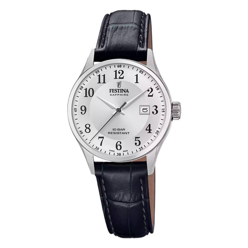 La montre Festina Swiss Made est un modèle dédié aux femmes, offrant une allure à la fois classique et raffinée. Son boîtier rond est fabriqué en acier 316L, connu pour sa robustesse et sa résistance à la corrosion, ce qui assure une longévité et un éclat notable. Le diamètre de 29,00 mm et l'épaisseur de 8,80 mm confèrent à la montre une taille discrète et féminine qui s'adapte confortablement à la plupart des poignets. Un fond vissé en orne la partie arrière, garantissant une efficacité optimale contre l'humidité et les agressions extérieures. Le verre utilisé est du saphir, une des matières les plus prisées en horlogerie pour sa durabilité remarquable et sa résistance exceptionnelle aux rayures.