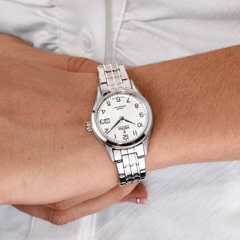 La montre dispose d'un délicat cadran de couleur grise. Guilloché en son centre et soleillé sur ses contours, le cadran apporte une touche de luminosité en harmonie avec le bracelet. Deux aiguilles argentées prennent place sur le centre du cadran. Ces aiguilles vous indiqueront les heures et les minutes de la manière la plus simple qui soit. Des index en chiffres arabes se positionnent sur la partie soleillé de la montre. Accompagnés d'un chemin de fer, ces index vous permettront de lire l'heure, mais aussi les minutes avec précision. Un guichet date vient se placer à trois heures et vous affichera la date du jour. Enfin, la mention de l'étanchéité est présente au-dessus de l'index de six heures et la marque signe son nom sous l'index de midi.