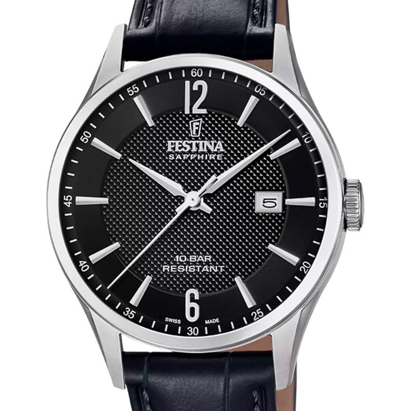 Voici un charmant garde-temps qui ne vous laissera pas insensible. Issu de la gamme Swiss Made de la fameuse maison horlogère Festina, il affiche un design oscillant entre le vintage et le moderne et se compose de matériaux d'exceptions. Son boîtier en acier inoxydable 316L vous garantira une solidité à toute épreuve. Son diamètre de 40mm pour une épaisseur de 10mm en fera un garde-temps idéal pour les poignets masculins. Protégeant votre cadran des chocs et autres rayures, un verre Saphir viendra se poser. Il se verra surplomber par une lunette fixe polie argentée du plus bel effet. A trois heures, vous retrouverez une couronne crantée qui vous sera utile afin de régler l'heure ainsi que le guichet date. C'est un fond de boîte vissé qui viendra assurer une étanchéité de 10 atmosphères à votre modèle.