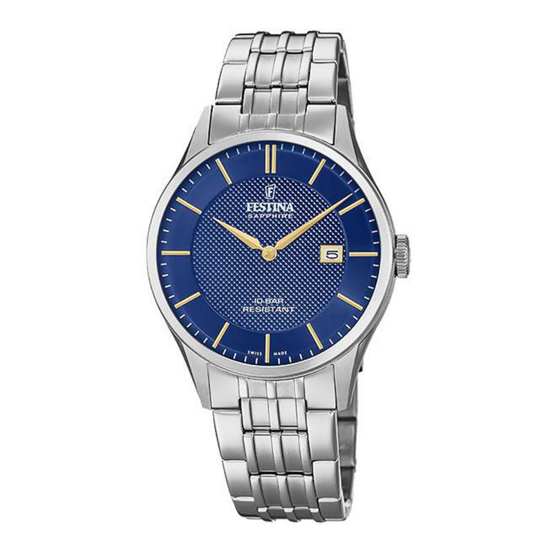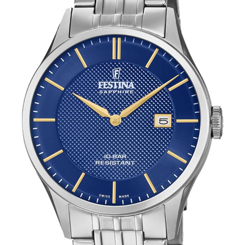 Le garde-temps Festina disposera d'un radieux cadran au fond de couleur bleue. Sa forme ronde accueillera parfaitement les éléments variés de la montre. Le cercle extérieur sera composé d'un chemin de fer des minutes blanc parsemé d'index bâtons de couleur dorée. La partie centrale qui comportera des petits piqués verra deux aiguilles s'installer dessus. Elles seront également marquées par cette couleur dorée qui donnera tout le charme et le chic du cadran. Un guichet date sur son fond blanc dans un cadran doré se situera à gauche de l'index de trois heures. L'indication de l'étanchéité se fera au-dessus de l'index de six heures. Sous l'index de midi le nom de l'horloger et son logo prendront place suivis de la mention Sapphire par rapport au verre utilisé.
