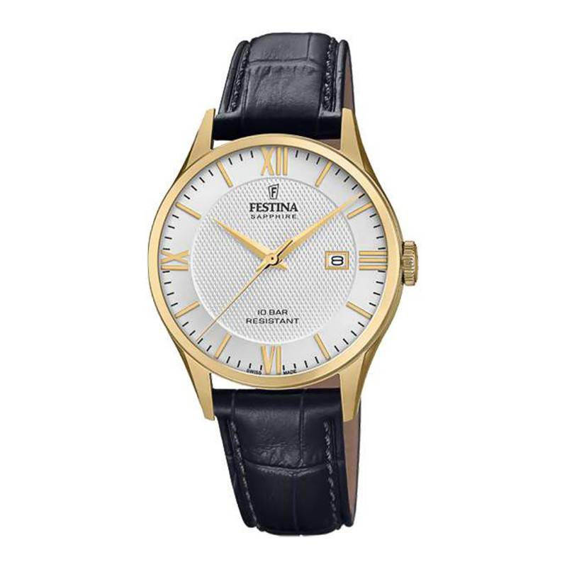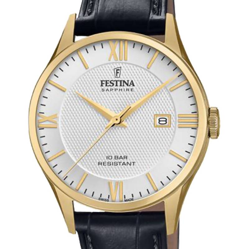 Festina vous fait découvrir le nouveau modèle de la collection Swiss Made pour homme. Cette magnifique montre présente un joli boîtier de forme ronde en acier inoxydable avec un revêtement PVD jaune. Son diamètre de 40 millimètres se posera avec confort sur les poignets masculins. De plus, ce garde-temps est équipé d'un verre saphir qui surplombe le cadran. Il assurera de la résistance face aux rayures et aux chocs que pourra recevoir la montre. Par ailleurs, une couronne crantée de couleur dorée vient prendre place à trois heures et vous permettra de régler les heures et les minutes ainsi que la date du jour. Enfin, le fond de boîte vissé garantira une étanchéité de 10 ATM.