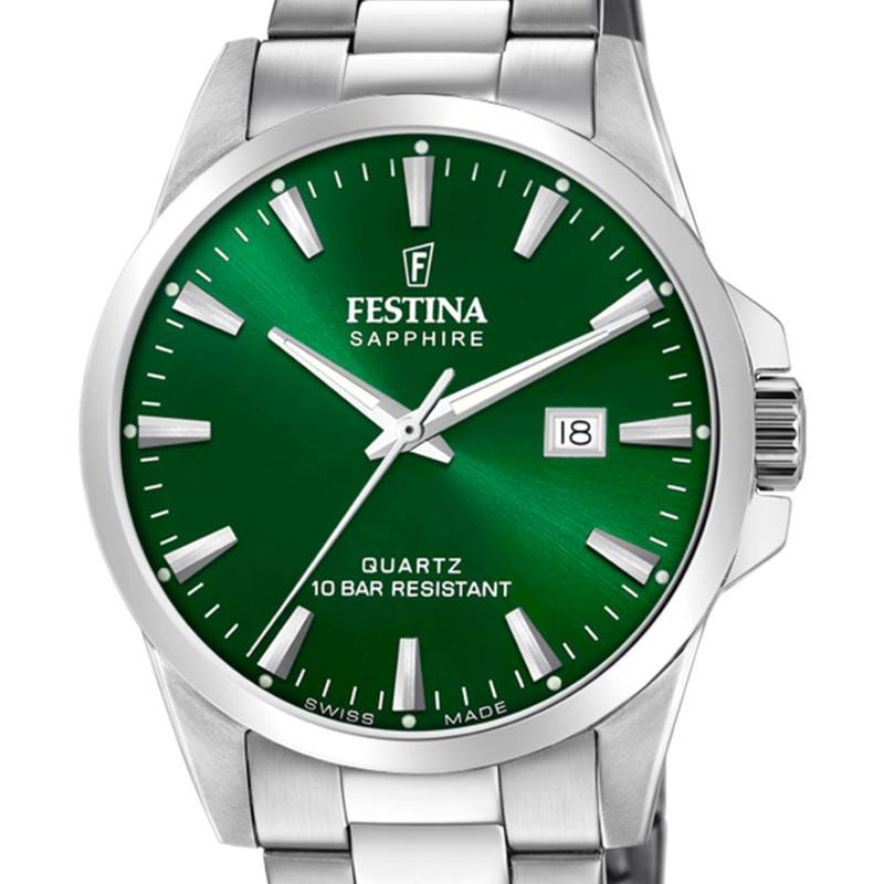 Festina est une marque horlogère de plusieurs décennies et qui enchante les amateurs de la belle horlogerie. D'origine suisse, elle propose des modèles à la fois classiques et sportifs qui seront du plus bel effet au poignet. Alliant technicité et résistance, elle confectionne des montres équipées et sophistiquées telles que la Swiss Made F20024/6. Cette dernière arbore un boîtier rond qui est réalisé en acier inoxydable brossé et poli affichant 41 mm de diamètre et 9,30 mm d'épaisseur. Robuste et soigné, celui-ci présente un verre saphir résistant qui protège son cadran des chocs éventuels. Il comporte les éléments centraux qui sont manipulés par la couronne grise située à 3 heures. Protégée et crantée, cette dernière vous accordera une prise en main facile. Enfin, ce modèle dispose d'une étanchéité de 10 ATM qui est assurée par son fond de boîte.