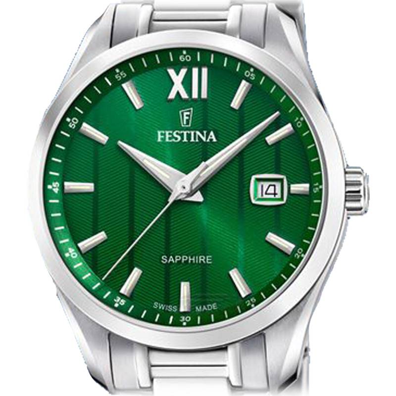 Cette montre est munie d'un cadran de couleur verte qui lui apporte une touche paisible. Son design est mis en avant par des finitions soleilléepour plus d'élégance. En son centre, vous retrouverez deux aiguilles qui se chargeront de vous communiquer les heures et les minutes. Celles-ci, ainsi que les index bâtons pour vous indiquer chaque minutes et qui vous offrira une lecture optimale. La trotteuse, quant à elle, se charge de désigner les secondes. Pour plus de précision sur la lecture temporelle, vous trouverez sur le rehaut du cadran un chemin de fer des minutes marqué par des graduations blanches. Pour finir, Festina signe sa création au niveau de l'index de midi substitué par un chiffre romain.