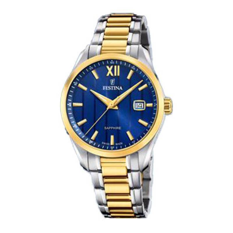 Festina est une entreprise horlogère née d'un grand héritage familial qui se perpétue encore aujourd'hui. Elle est connue pour mettre au point de belles montres sophistiquées aux designs charmants. Cette marque se distingue pour ses modèles qui sont conçus avec des matériaux résistants de haute qualité. Festina vous dévoile cette magnifique montre issue de la collection Swiss Made. Elle arbore un boîtier de forme ronde fait en acier à la finition polie. Ce dernier dispose d'un diamètre de 37,50 mm et conviendra parfaitement aux poignets masculins. Ce boîtier, de couleur argentée et dorée, est surplombé par un verre saphir qui le préservera des rayures et des chocs extérieurs. À 3 heures, vous trouverez une couronne crantée qui vous donnera la possibilité de régler les différentes fonctionnalités et à l'arrière vous verrez un fond de boîte assurant une étanchéité de 5 ATM.