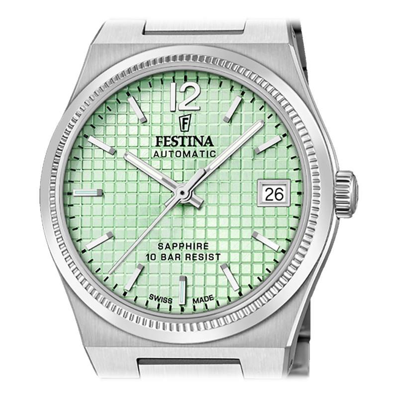 Ce cadran circulaire confère une touche raffinée à ce modèle. Rehaussé d'une finition soleillée, il se pare d'un joli ton vert clair qui élèvera votre style au quotidien. Sa surface est entièrement magnifiée par des motifs carrés qui lui apportent un aspect attrayant. Sur son pourtour, se trace un chemin de fer des minutes qui est accompagné d'index bâtons et d'un chiffre arabe à 12 heures. Ces derniers marqueront les heures et seront survolés par les trois aiguilles argentées fixées au centre. De type bâton, elles vous marqueront le temps avec précision. La fine trotteuse désignera toutes les secondes écoulées. Elle est accompagnée d'une courte aiguille qui démarque les heures tandis que la grande totalise les minutes. Ces deux dernières ainsi que les index à 6 et 9 heures sont revêtus d'un traitement luminescent qui vous garantit une meilleure lisibilité en cas de faible luminosité. Vers 3 heures, un guichet date se place dans le but de vous indiquer la date du mois en cours et à 6 heures sont mentionnés le label Swiss Made, le type de verre et l'étanchéité de cette montre. Enfin, la marque appose son nom sous midi en guise de signature.