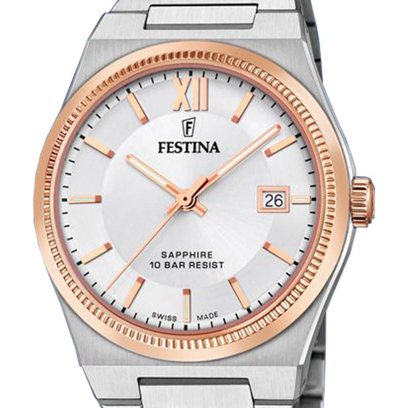 Festina est une marque horlogère qui vous propose des garde-temps aux designs saisissants. Elle confectionne des montres équipées et sophistiquées capables de vous accompagner dans toutes les situations. Allant des modèles classiques aux plus raffinés, elle vous invite à découvrir ses magnifiques montres telles que la Swiss Made F20036/1. Fabriquée pour les hommes, cette dernière dévoile un boîtier tonneau qui est réalisé en acier inoxydable brossé. Celui-ci affiche 40 mm de diamètre et dispose d'une lunette rosée et crantée qui entoure le verre saphir ayant pour but de protéger le cadran des chocs. Ce dernier comporte les éléments qui seront manipulés par la couronne rosée crantée qui se trouve à 3 heures. Vous noterez que ce garde-temps se ferme par un fond vissé qui lui assure une étanchéité de 10 ATM.
