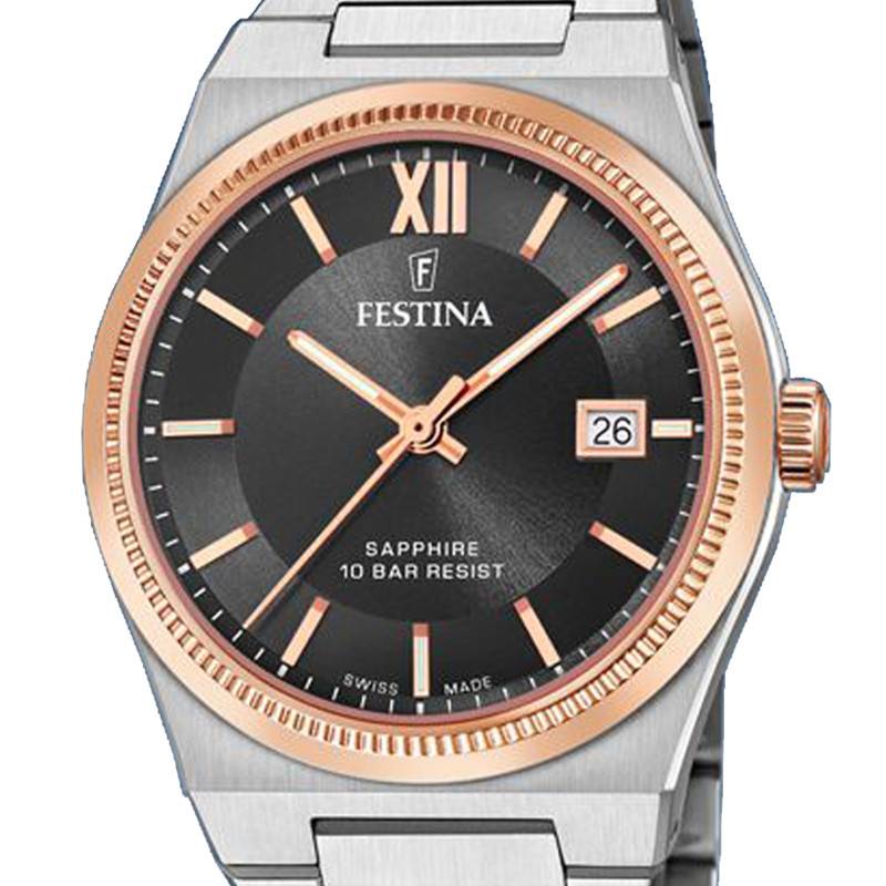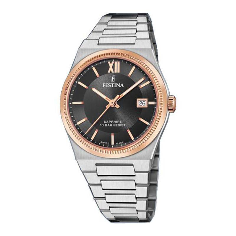 Festina est une marque espagnole qui a su se distinguer grâce à ses créations élégantes et performantes. Elle confectionne des montres hautement sophistiquées, équipées et idéales pour vos plus belles occasions. Grâce à sa maîtrise et son expérience, la marque vous propose des modèles parfaitement robustes afin de vous accompagner dans toutes vos aventures. Découvrez la montre Swiss Made F20036/3 qui vous ira à ravir. Façonnée pour les hommes, elle se pare d'un boîtier tonneau qui est fabriqué en acier inoxydable brossé. Affichant 40 mm de diamètre, ce dernier est doté d'une lunette rose texturée qui lui apporte charme et prestance. Celle-ci entoure un verre saphir résistant qui a pour rôle de protéger le cadran des chocs potentiels. À 3 heures, se place une couronne crantée rose qui permet la manipulation des différents éléments centraux. Enfin, cette montre est dotée d'un fond vissé qui lui assure une étanchéité de 10 ATM.