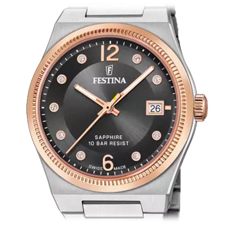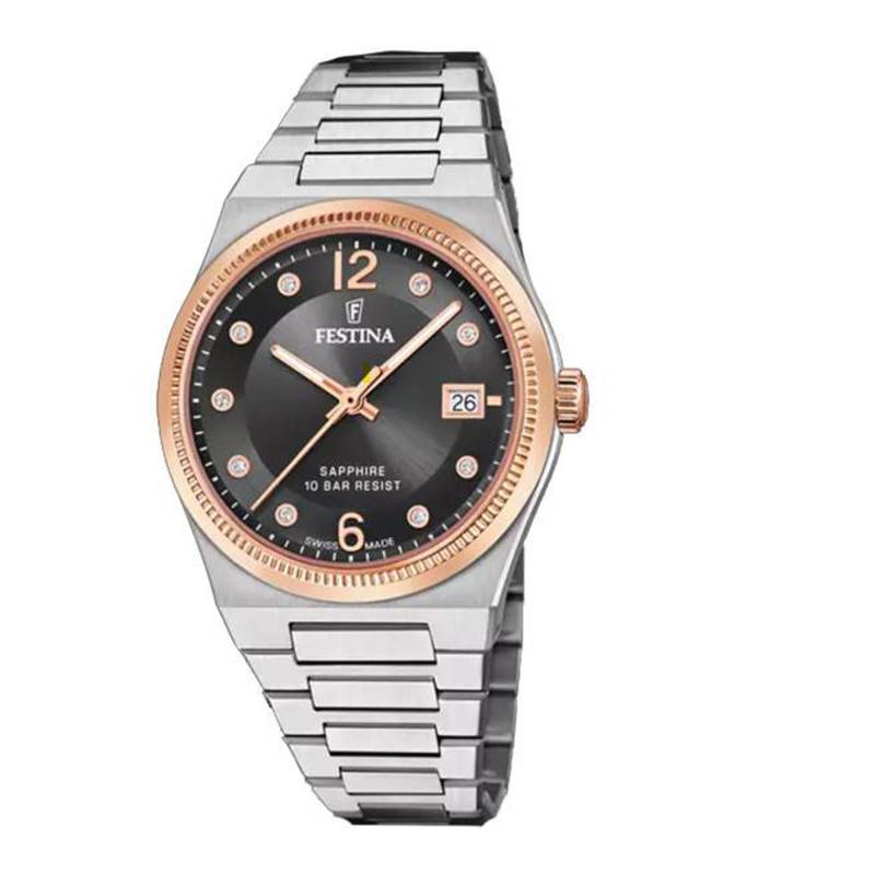 Forte de plus de 100 ans d'expérience dans le domaine de l'horlogerie, Festina propose des merveilleux garde-temps dont la qualité et la robustesse ne sont plus à prouver. Ses modèles démontrent une grande fiabilité et des designs élégants et raffinés. Parmi ceux-ci, nous vous proposons cette montre Swiss Made F20037/3 qui présente un aspect classique et sophistiqué avec des finitions réussies. Elle possède un boîtier tonneau conçu en acier inoxydable finement brossé en harmonie avec la lunette texturée de couleur rose doré. Celui-ci affiche un diamètre de 35 mm et une épaisseur de 8,60 mm avec une ouverture de cadran de 27,50 mm, ce qui offre une agréable lisibilité. Cette dernière est accentuée par la présence d'un verre saphir plat qui promet une excellente protection contre les rayures et contraste joliment avec les couleurs du boîtier. Cette esthétique se poursuit sur la couronne crantée placée à 3 heures qui permet un réglage facile des heures, des minutes et de la date. Le tout est fini par un fond emboîté qui propose une étanchéité de 10 ATM.