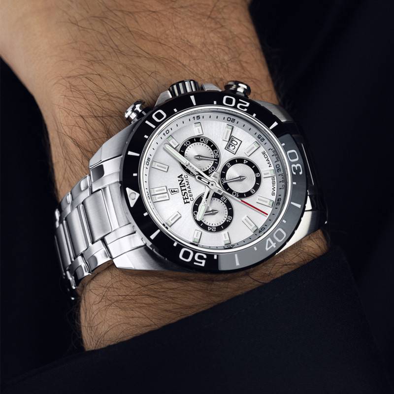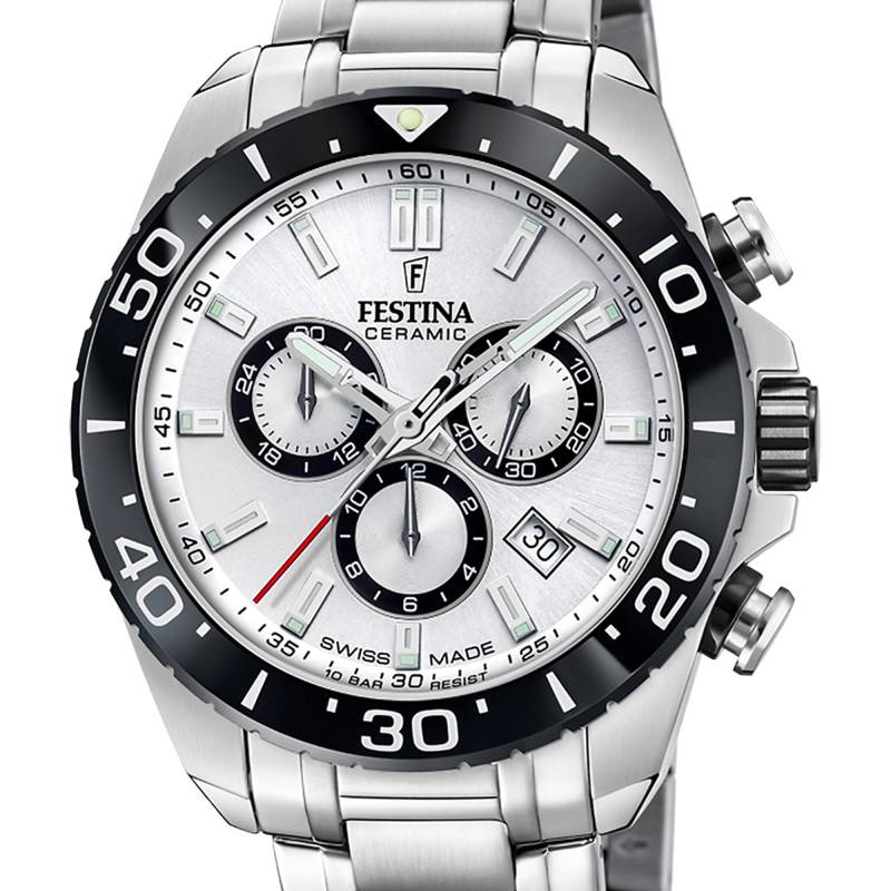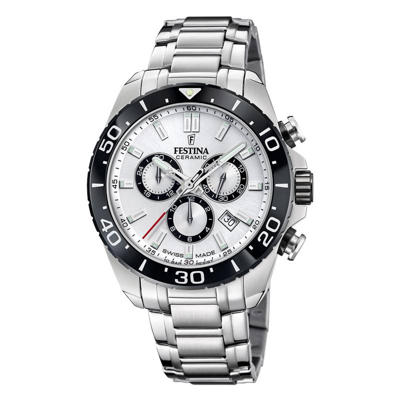 Festina est une marque proposant des garde-temps robustes et fiables destinés à vous accompagner au quotidien. Ses modèles arborent design et technicité dans le but de vous apporter une expérience unique. Forte d'un savoir-faire hors pair, la marque vous confectionne des créations totalement fonctionnels tels que la montre Swiss Made F20042/1. Destinée aux hommes, elle dévoile un boîtier fabriqué en acier inoxydable brossé et poli. Il prend une forme ronde avec 44 mm de diamètre présente une lunette ronde avec un insert en céramique noire comportant un chemin de fer des minutes avec un marqueur luminescent. Crantée, celle-ci entoure un verre saphir qui protège le cadran des chocs potentiels. Celui-ci comprend les différents éléments centraux qui sont manipulés par les boutons fixés sur la droite. Il s'agit d'un bouton remontoir cranté et protégé ce qui vous accordera une prise en main facile et de deux boutons-poussoir gris qui l'avoisinent. Pour finir, ce modèle se ferme par un fond de boîte assurant une étanchéité de 10 ATM.