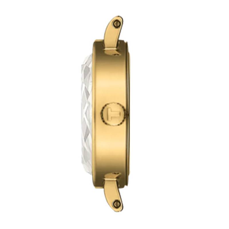 La montre Tissot T Lady Lovely Round se révèle être un bijou horloger de haute précision et d'élégance raffinée. Le boîtier rond en acier inoxydable 316L avec une magnifique finition PVD jaune confère une allure intemporelle et luxueuse à ce garde-temps. Ce choix de matériau assure non seulement une résistance exceptionnelle à la corrosion et aux rayures, mais également une brillance durable. Avec un diamètre de 19,50 mm et une épaisseur de 6,30 mm, elle s'ajuste parfaitement au poignet féminin pour une apparence à la fois discrète et sophistiquée. Son fond de boîte est emboité, garantissant ainsi une sécurité accrue pour le mouvement interne, tout en reflétant un design soigné et épuré.