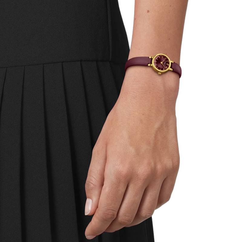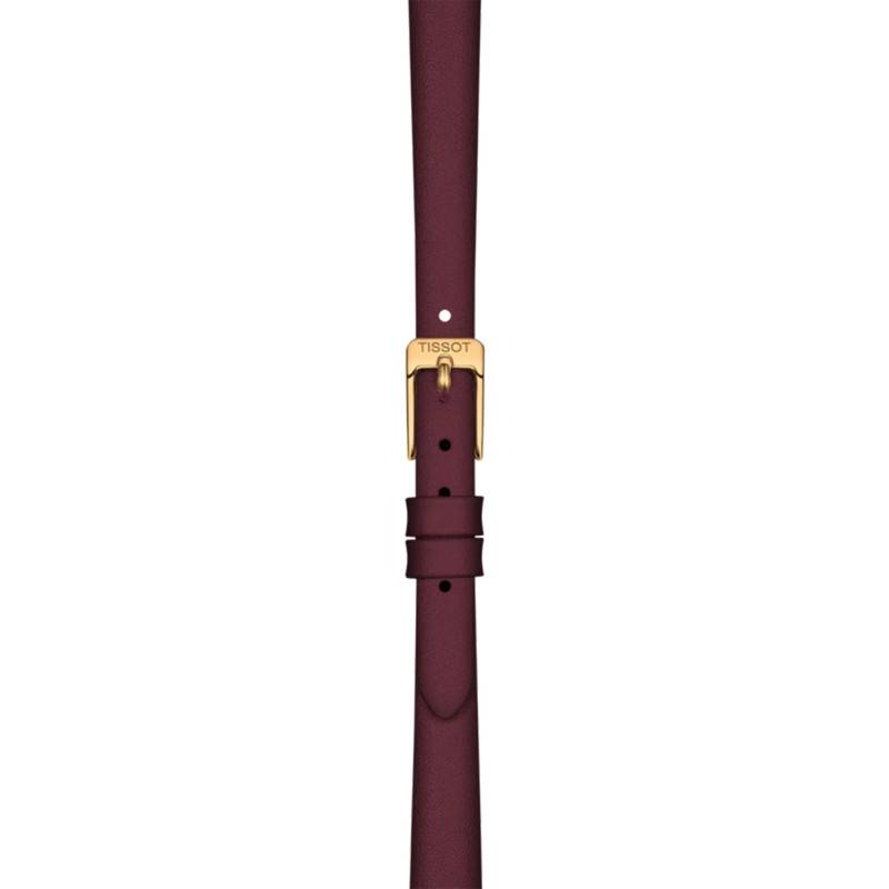 Le bracelet de cette montre Tissot est confectionné en cuir de vachette somptueux, teinté d'une couleur bordeau subtile et élégante, accentuant ainsi l'éclat du boîtier doré. Avec une largeur d'entrecorne de 6 mm, ce bracelet s'ajuste en parfaite harmonie avec son boîtier délicat, définissant un ajustement confortable et sécurisé. Le choix d'une boucle ardillon pour le fermoir garantit une fermeture fiable et classique, facile à utiliser, complétant ainsi la sophistication de l'ensemble.