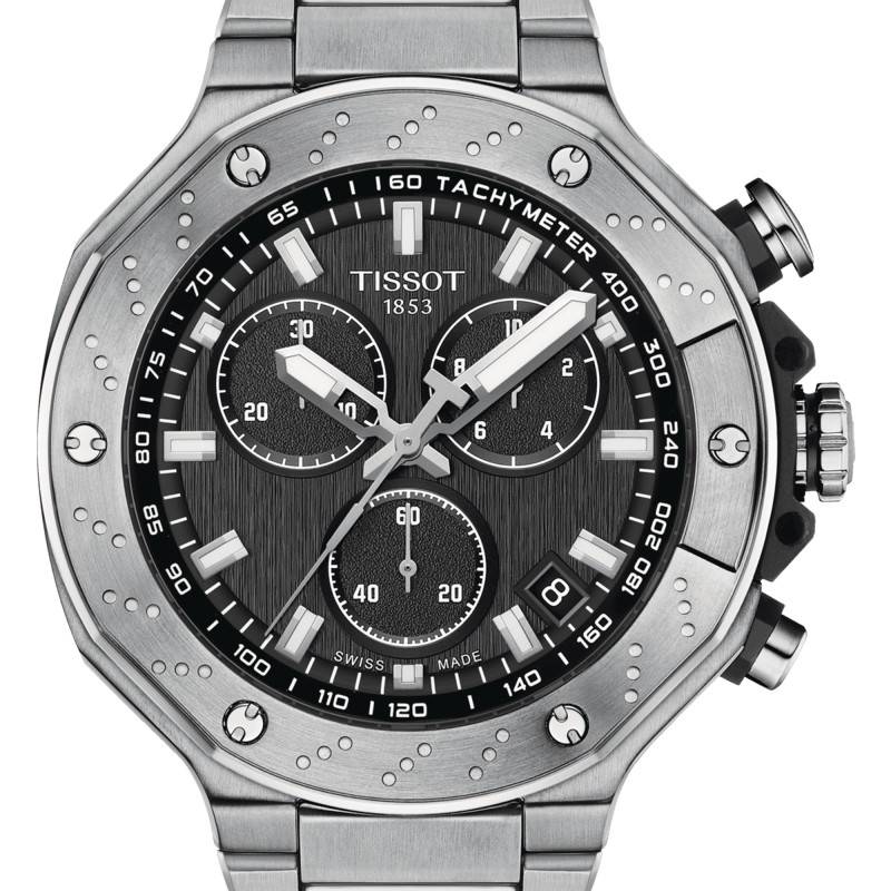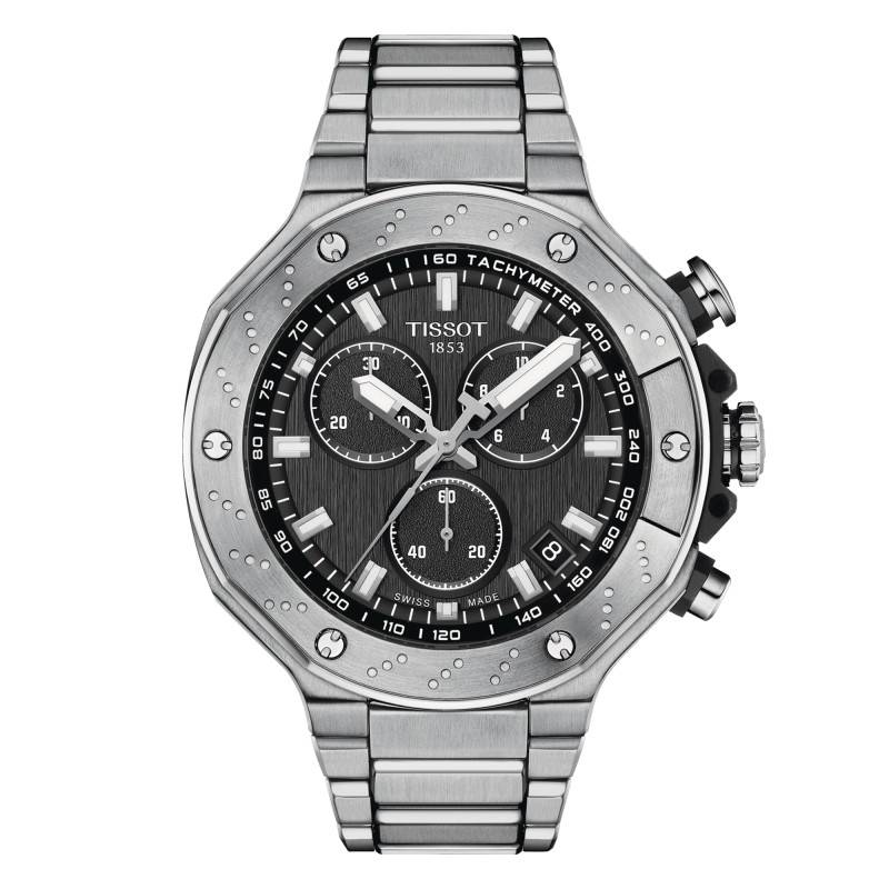 Créée en 1853, Tissot a une riche histoire qui est à la fois le moteur et le catalyseur de la marque. Alliant tradition et innovation, l'enseigne suisse se démarque par un savoir-faire traditionnel parfaitement combiné à une technologie avancée. La montre T-Race Chronograph T141.417.11.051.01 est une incarnation de l'ADN Tissot et fait preuve d'une attention méticuleuse aux détails. Ce modèle est proposé avec un boîtier octogonal affichant des lignes soigneusement sculptées. Conçu en acier inoxydable 316L, il arbore une noble couleur argentée et une finition brossée très réussie avec un modeste polissage sur la bordure de la lunette. Maintenue par des vis, celle-ci est sublimée par des points qui lui offrent un agréable rendu. Elle entoure soigneusement un verre saphir plat inrayable de traitement antireflet qui offre une excellente lisibilité du cadran. Adapté aux poignets masculins, ce boîtier affiche un diamètre de 45 mm et une épaisseur de 11,76 mm pour un poids de 199 g. À 3 heures, vous trouverez la couronne crantée, siglée et protégée qui assure le réglage des aiguilles et de la date. Elle est délimitée de part et d'autre par des boutons-poussoirs, dont l'un de ces deux affiches une forme pompe. Quant au fond emboîté, il présente un centre plein et brossé et promet une étanchéité de 10 ATM.