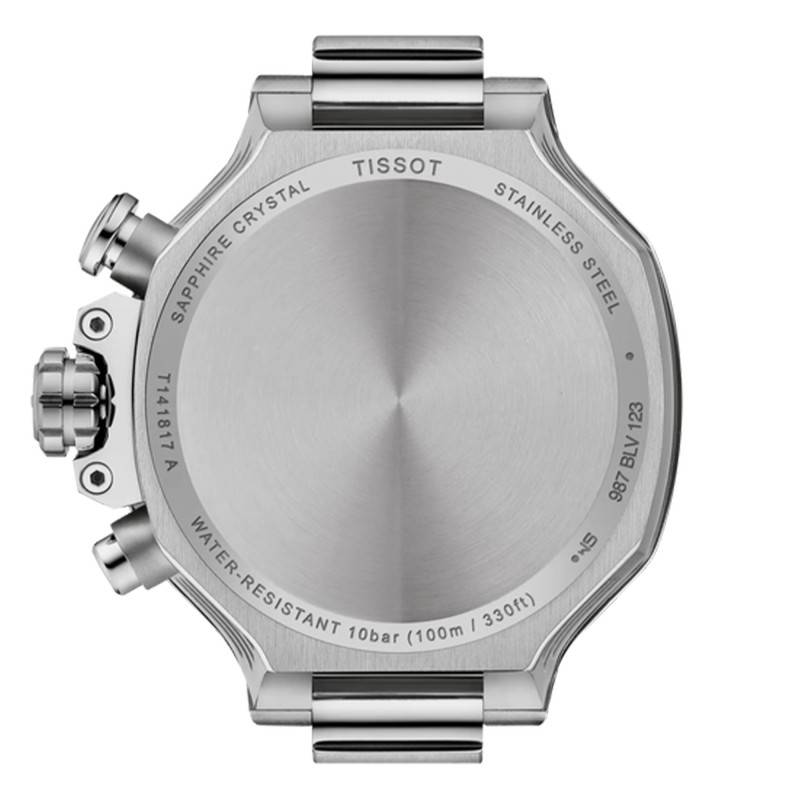 Le cadran de cette montre présente une couleur noire avec une finition striée qui capture la lumière de manière spectaculaire, ajoutant une dimension de profondeur et de texture. Les aiguilles et index sont dotés d'une matière luminescente, assurant une lisibilité optimale même dans les conditions de faible luminosité. Ce cadran complexe abrite également trois sous-compteurs qui permettent une lecture détaillée du temps : un compteur de 12 heures, de 30 minutes, et une petite seconde, parfaits pour le chronométrage des activités. Un guichet de date est discrètement intégré pour compléter la fonctionnalité sans surcharger l'esthétique globale. Les chiffres arabes et un chemin de fer des minutes entourant le cadran ajoutent à la clarté visuelle, tandis que la nomination discrète de Tissot à 12 heures rappelle la qualité suisse incontestable.