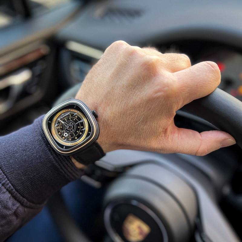 Marque unique de par ses designs, SevenFriday a su se faire un nom dans l'univers très concurrentiel de l'horlogerie. Aujourd'hui, dans la pure continuité de sa philosophie, la manufacture est heureuse de vous présenter le nouveau fruit de sa création, la montre T2/06 - T-Works. S'inspirant de la science-fiction et de la révolution industrielle, ce garde-temps arbore un look très néo-rétro. Tout d'abord, son boîtier, complètement façonné en acier inoxydable, bénéficie d'une couche de PVD noir, dont les finitions alternent entre des faces polies et satinées. Ce mélange lui confère un aspect résolument industriel, pouvant même rappeler l'aspect d'un outil en fonte. Concernant ses dimensions, vous trouverez un diamètre de 45 mm hors-couronne et une épaisseur de 12.95 mm. Avec ces valeurs, c'est une montre qui s'orientera plutôt vers la gente masculine. La lunette abrite une sublime rainure remplie de laque Berlac Or, évoquant les collecteurs et jauges que vous pouviez trouver sur les machines à vapeur de l'époque. Dans l'optique de protéger correctement le cadran, un verre minéral durci K1 a été déposé. Disposée à 3h, vous trouverez une couronne de remontoir, également acier inoxydable PVD noir. Petit détail intéressant, notez que le sommet de cette dernière est décoré du logo de la marque "7F". Le fond de boîte s'avère être maintenu par 4 vis et a été conçu en polycarbonate afin de permettre à votre garde-temps d'établir une connexion entre sa puce NFC et votre téléphone. Vous y trouverez des informations techniques relatives à la montre telles que ses dimensions ou encore son étanchéité à 3 ATM. De plus, vous pourrez lire la mention NFC indiquant qu'une puce de cette nature est présente dans ce modèle. Grâce à cette dernière, vous pourrez vous authentifier avec l'application SevenFriday et ainsi enregistrer votre montre.