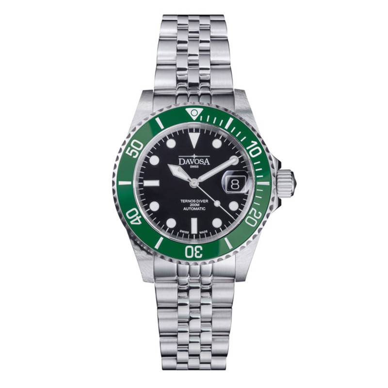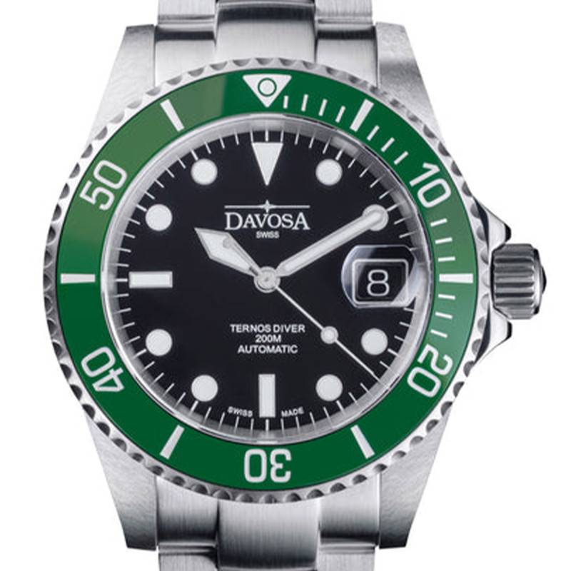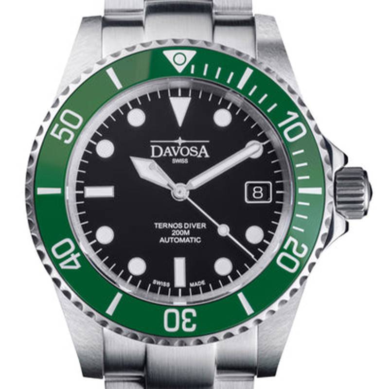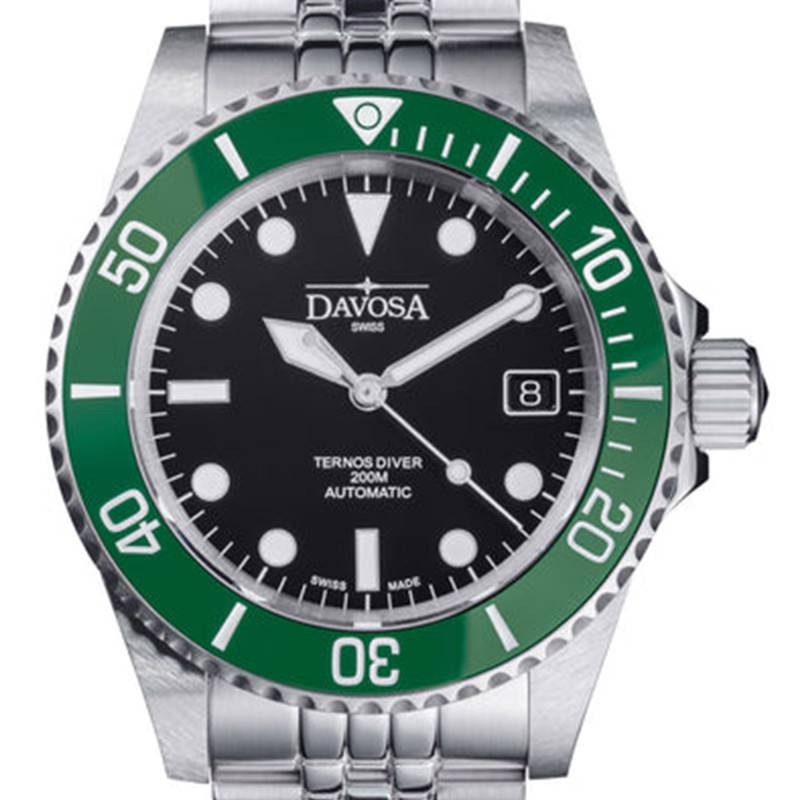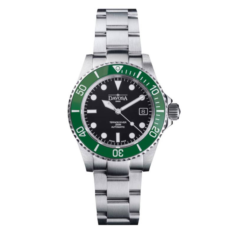 La montre Ternos Diver Automatic 40 mm Green de Davosa incarne l'excellence suisse en matière d'horlogerie. Cette pièce horlogère masculine est conçue pour les hommes audacieux qui recherchent à la fois l'élégance et la robustesse. Le boîtier rond de 40 mm de diamètre, fabriqué en acier inoxydable brossé et poli, offre un équilibre parfait entre sophistication et endurance. Son poids de 165 g confère une présence substantielle au poignet, tout en assurant un confort optimal. La montre arbore une allure sportive avec sa lunette en céramique verte unidirectionnelle, qui propose un compte à rebours visuel parfait pour les activités de plongée et de navigation.