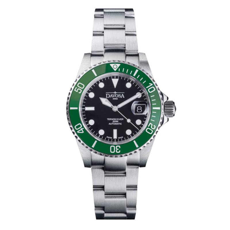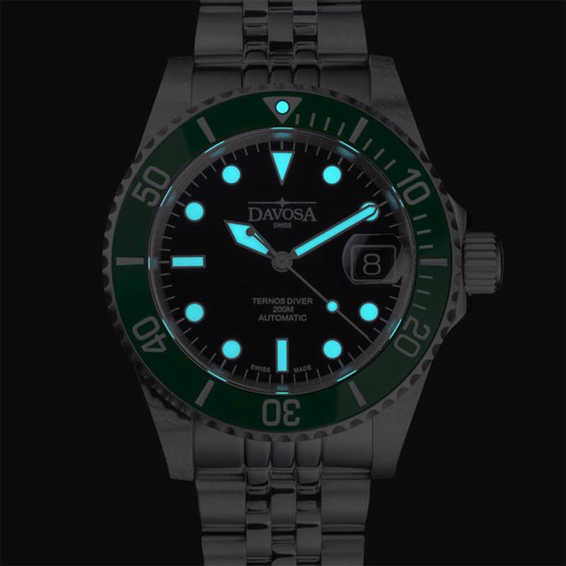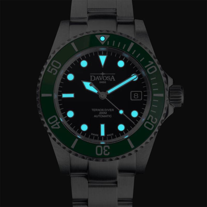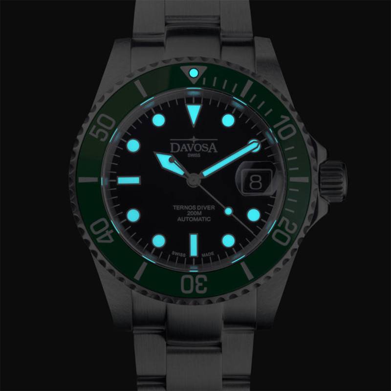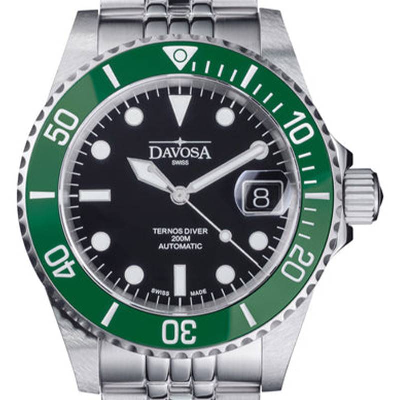 La montre Ternos Diver Automatic 40 mm Green de Davosa incarne l'excellence suisse en matière d'horlogerie. Cette pièce horlogère masculine est conçue pour les hommes audacieux qui recherchent à la fois l'élégance et la robustesse. Le boîtier rond de 40 mm de diamètre, fabriqué en acier inoxydable brossé et poli, offre un équilibre parfait entre sophistication et endurance. Son poids de 165 g confère une présence substantielle au poignet, tout en assurant un confort optimal. La montre arbore une allure sportive avec sa lunette en céramique verte unidirectionnelle, qui propose un compte à rebours visuel parfait pour les activités de plongée et de navigation.