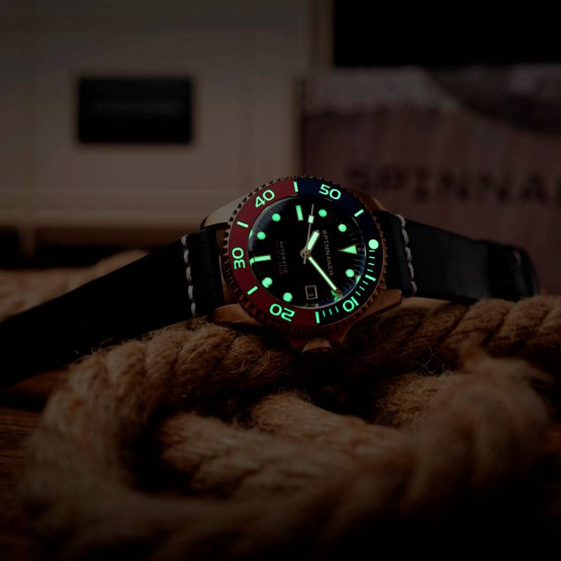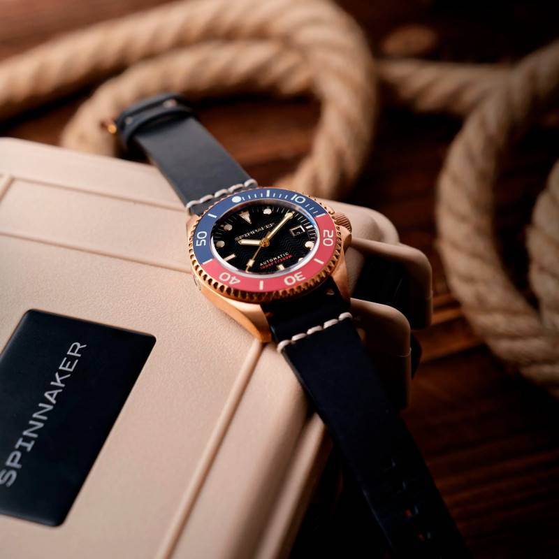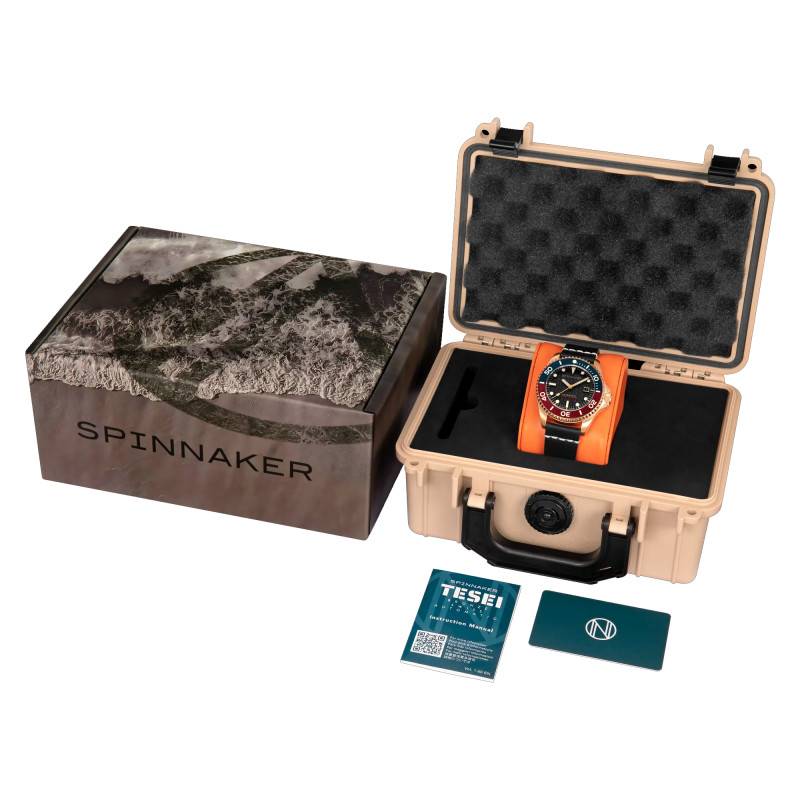 Spinnaker propose des modèles associant une expertise remarquable, des designs soignés et des mécanismes précis. Cette jeune marque horlogère a su se démarquer sur le marché par ses montres élégantes et précises fabriquées à partir de matériaux de grande qualité. Ses garde-temps seront des compagnons parfaits en mer comme au quotidien. C'est le cas de cette montre Tesei Bronze Swiss Automatic Soda Black SP-5060-08, créée pour rendre hommage à Teseo Tesei, un ancien Officier de la marine italienne et inventeur de la torpille humaine. Elle arbore un boîtier rond fait en bronze avec des finitions brossé et polie, ce qui lui confère un design exceptionnel. D'un diamètre de 43 mm, d'une épaisseur de 16 mm et d'une longueur de 52 mm, ce dernier conviendra parfaitement aux poignets masculins. Il affiche un poids de 126 gr et le cadran est protégé contre les chocs par un verre saphir permettant une excellente lisibilité grâce à son traitement antireflet. La montre est munie d'une lunette crantée et rotative avec insert en céramique bicolore à effet "Pepsi" comportant une échelle de minutes dotée d'un revêtement Superluminova. Les fonctions principales de la montre sont réglées par la couronne crantée et vissée à 3 heures affichant le logo de la marque. Enfin, ce modèle est équipé d'un fond de boîte vissé et transparent, garantissant une étanchéité de 300 mètres, soit 30 ATM, et offrant une belle vue sur le mouvement.